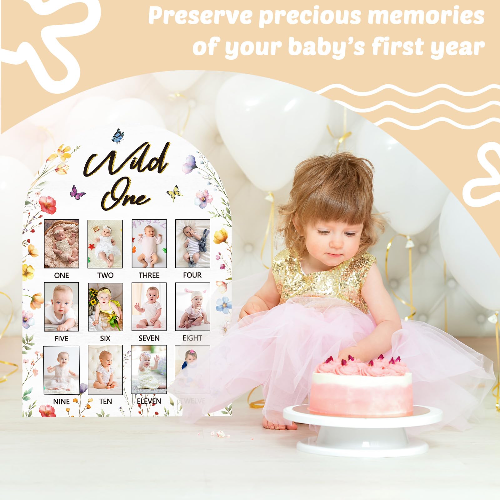 • Q: What design features does the photo board have? A: The board features a charming wildflower design with delicate butterfly patterns and 'Wild One' lettering.