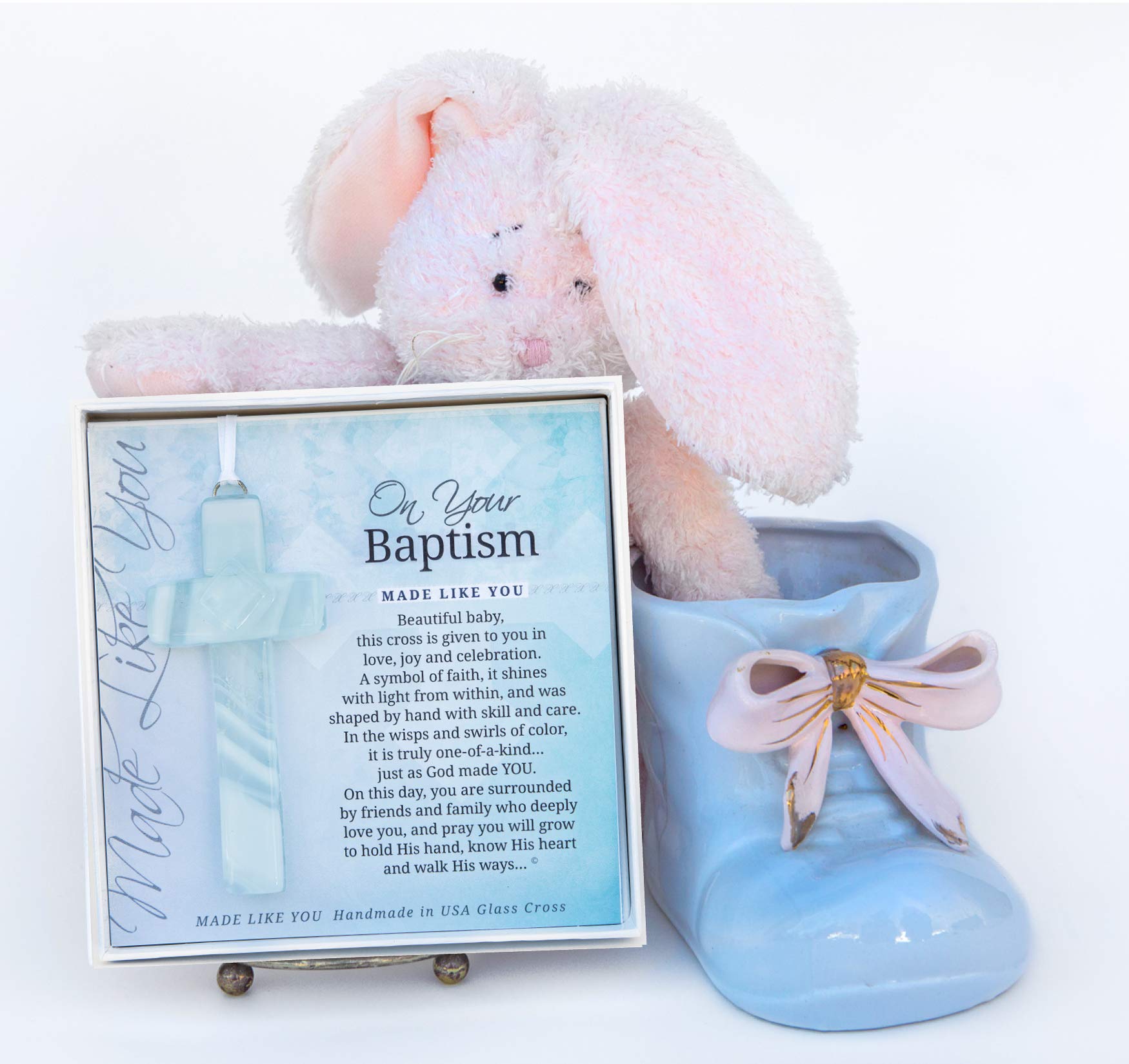 - Q: Is this cross suitable for both boys and girls? A: Yes, this handmade aqua glass cross is a treasured baptism gift suitable for both baby girls and boys.