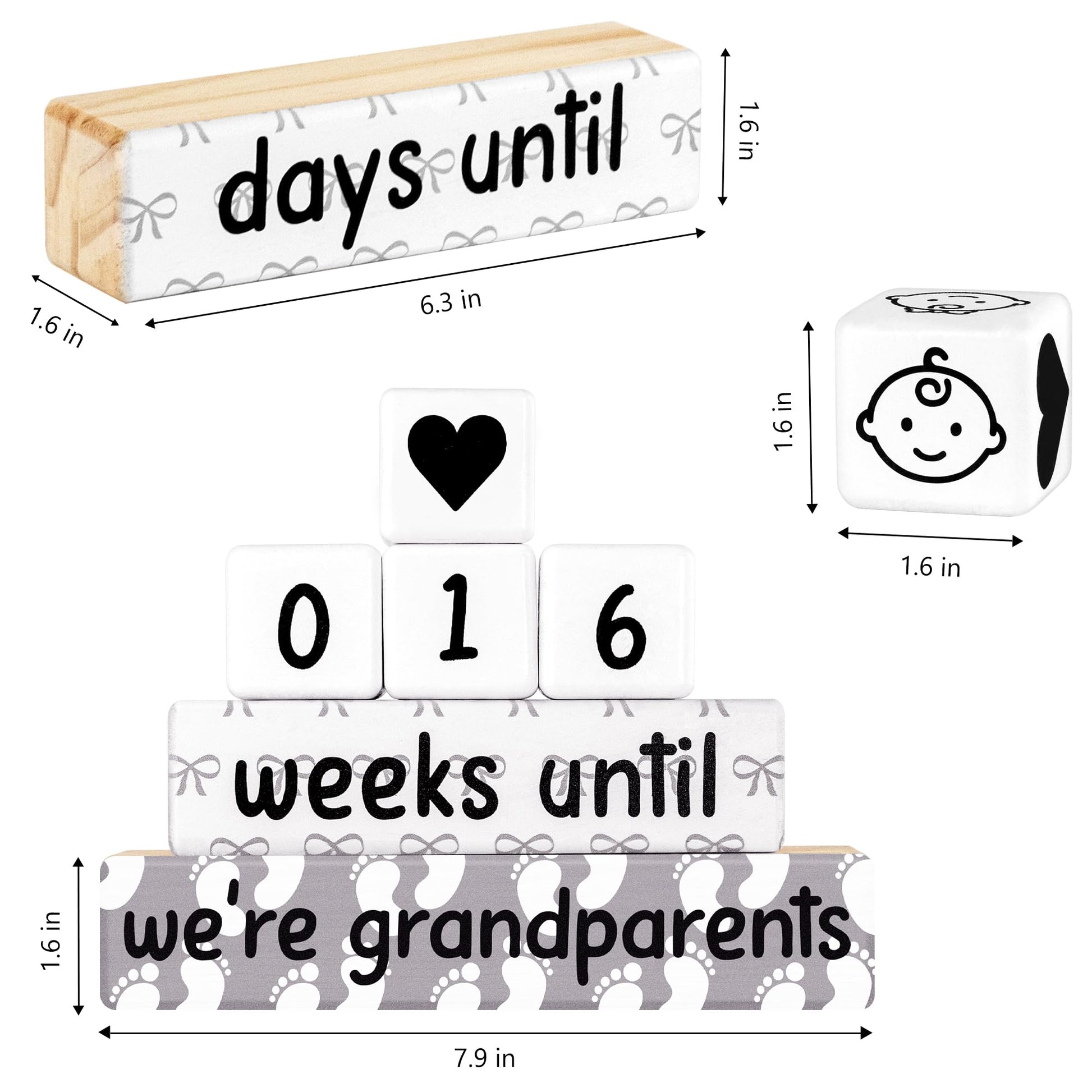 - Q: What is included in the Pregnancy Announcement Countdown Blocks set? A: The set includes a middle block with 'days until' and 'weeks until' on either side, four interchangeable number blocks to count down the days and weeks, and a bottom block that says 'We're Grandparents'.