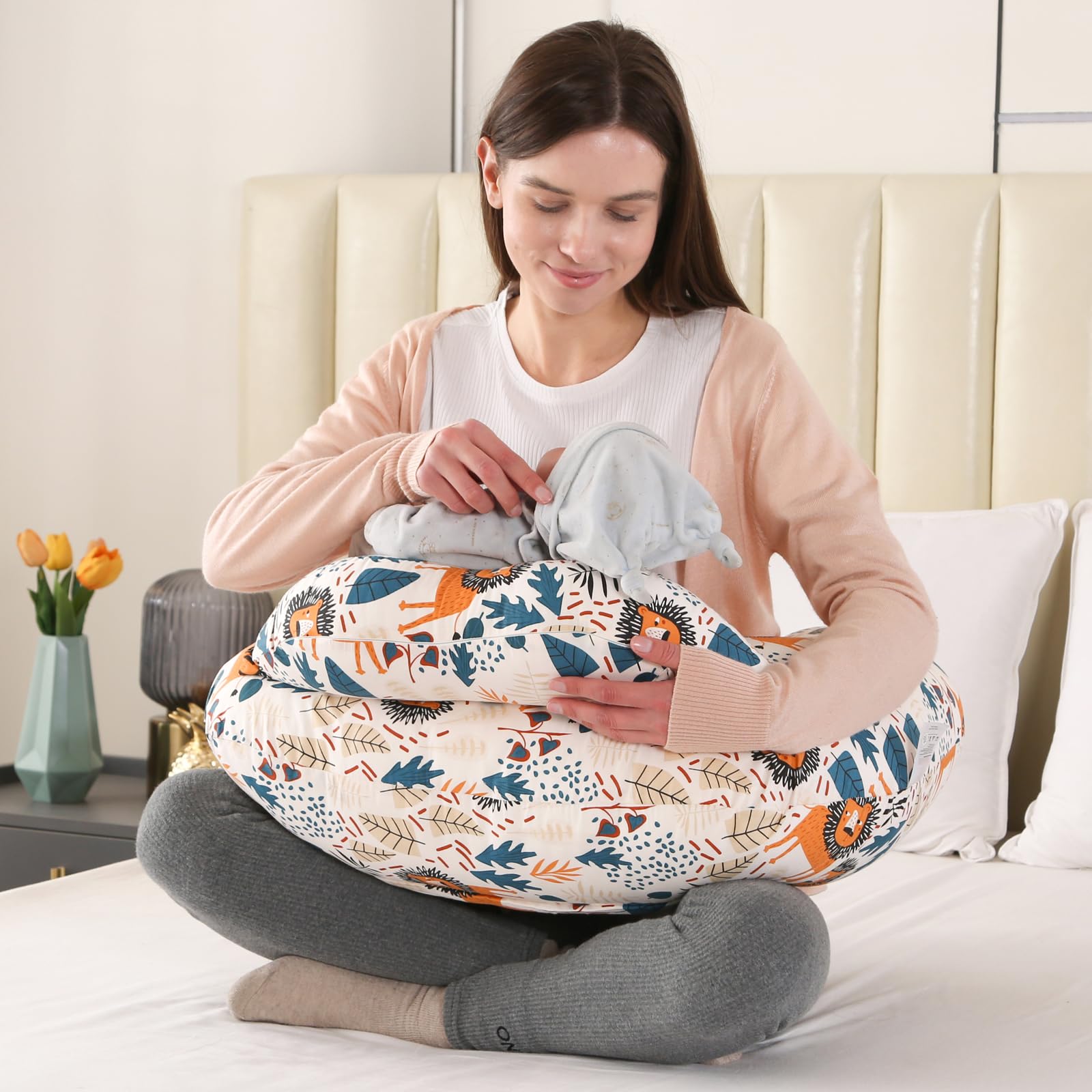 The BATTOP Feeding and Infant Support Pillow comes with a removable pillow cover with an easy-on covered zipper design. Make moms' breastfeeding life so much easier BATTOP Nursing Pillow is designed for moms, take pressure off your arms and back by lifting your baby to a more ergonomic position when nursing or bottle feeding. This causes you to breathe easier, promotes better circulation, and aids in muscles relaxation. Say goodbye to any pain and sore arms With this pillow, baby also won't cause pressure on your postpartum wounds. It is definitely a good helper during the postpartum recovery! Suitable for All Baby Holding Positions This offers so much support whether youre cross-cradling, cradling, football/rugby holding your newborn while feeding. 100% Cotton Cover, Safely Care for Baby With Adjustable Waist Belt, Keep the Pillow Stay in Place It help this pillow hugs your body securely and stays in ideal position, no need to raise the pillow frequently. The belt is legth 45cm, fit most body size, dads also can use it. All-in-One and Widely-Use Pillow It is also a good infant sit-training pillow. In addition, you can sleep with it, sit in to relieve any pain from parturition, or use it to give your back extra support while reading. It also can help family members who need some assistance to hold baby safely.