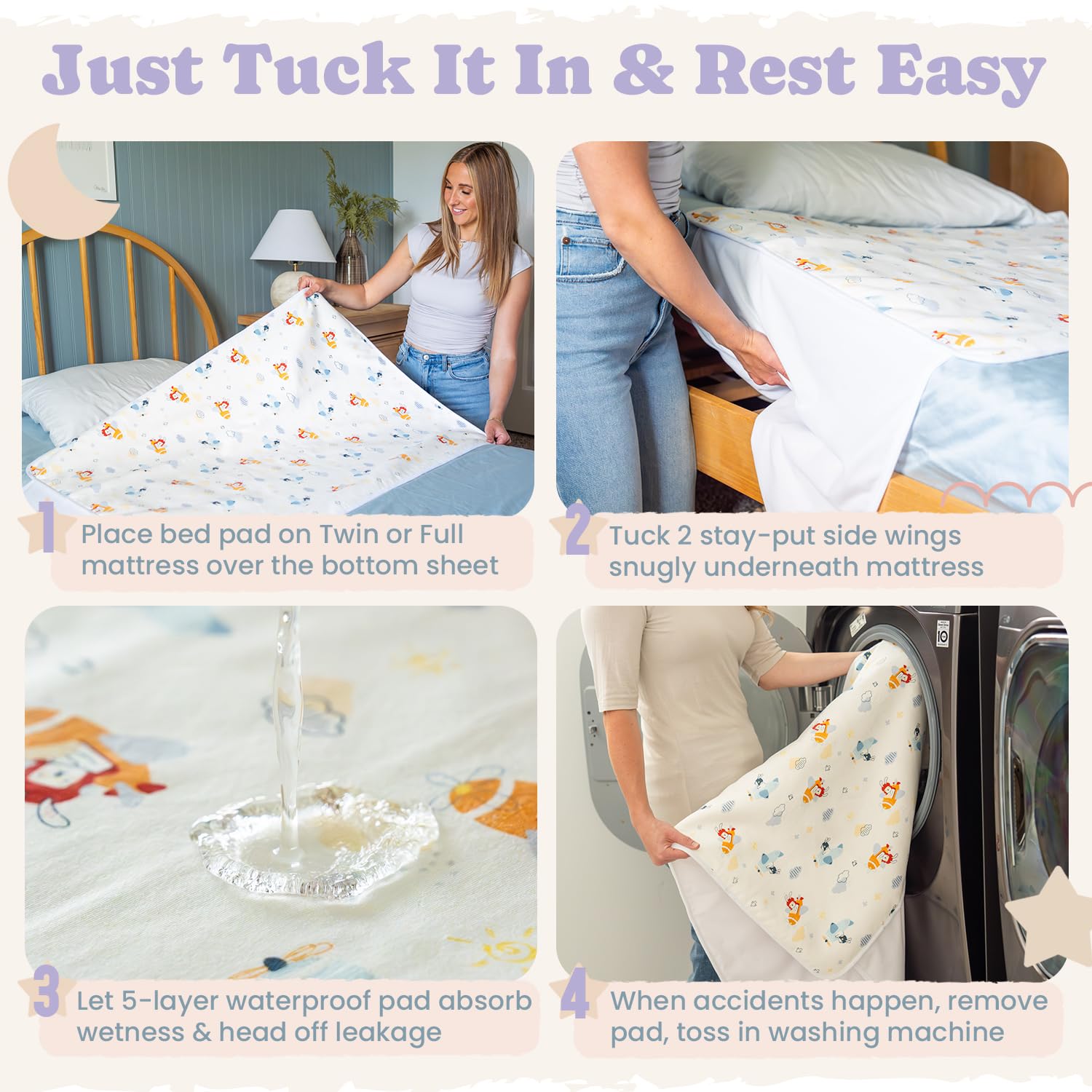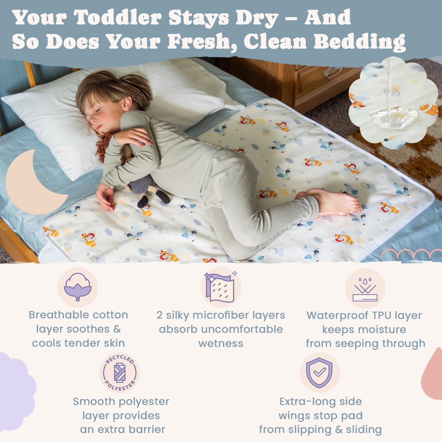 - Q: How many absorbent layers do these pads have? A: The bed wetting pads feature five absorbent layers to effectively contain moisture and prevent leaks.