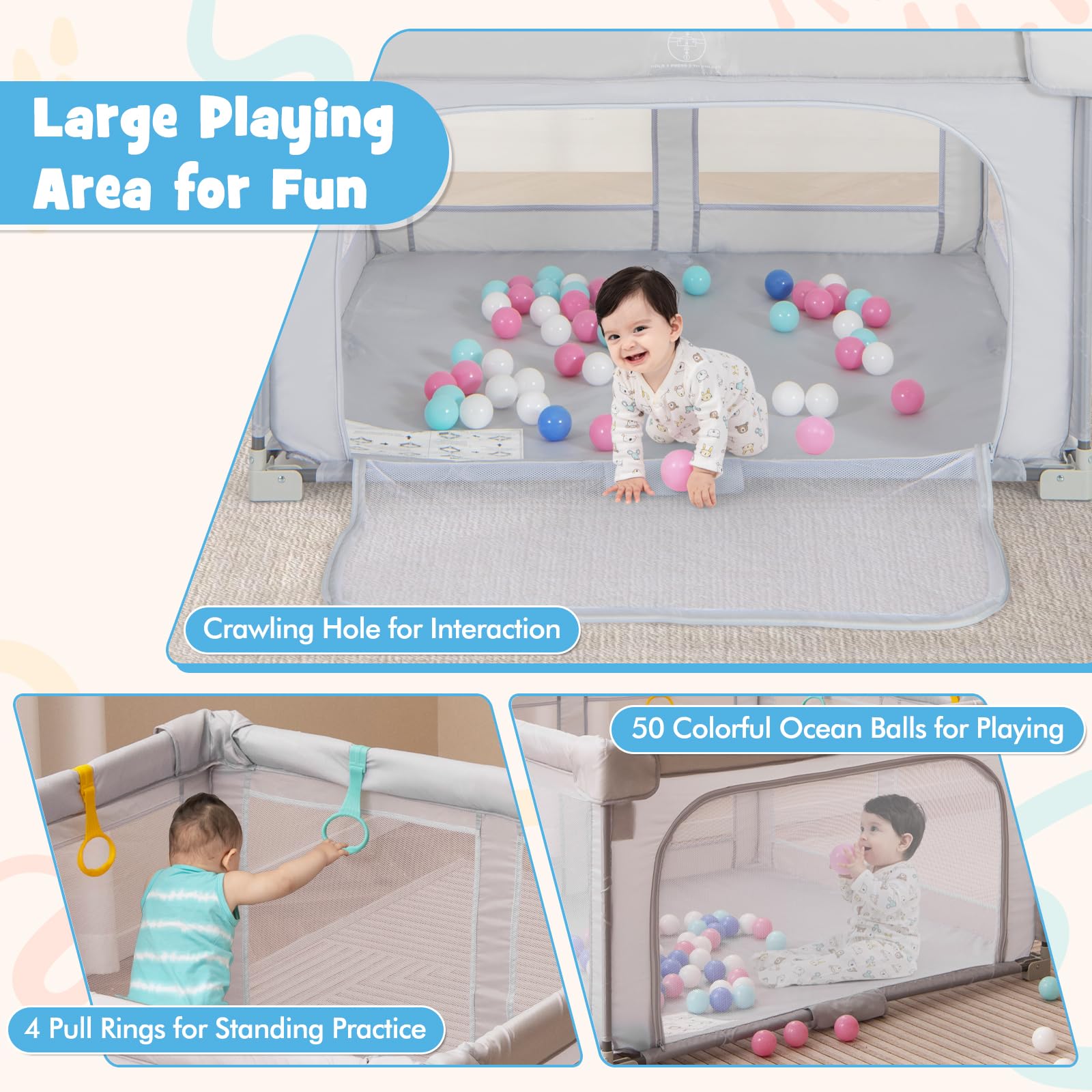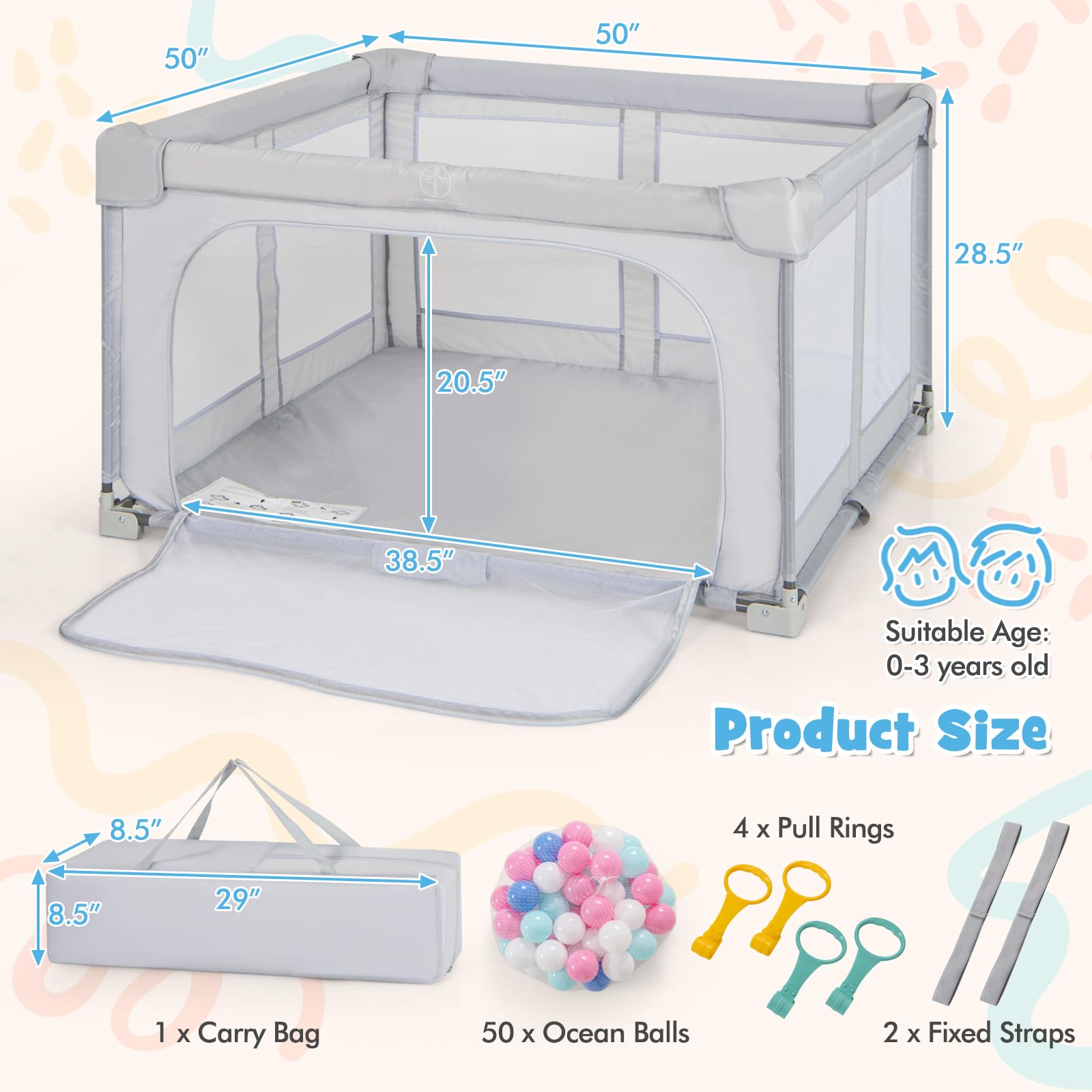 - Q: What accessories are included with the playpen? A: The package includes 1 baby playpen, 50 ocean balls, 4 pull-up rings, 1 carry bag, and 1 user guide.