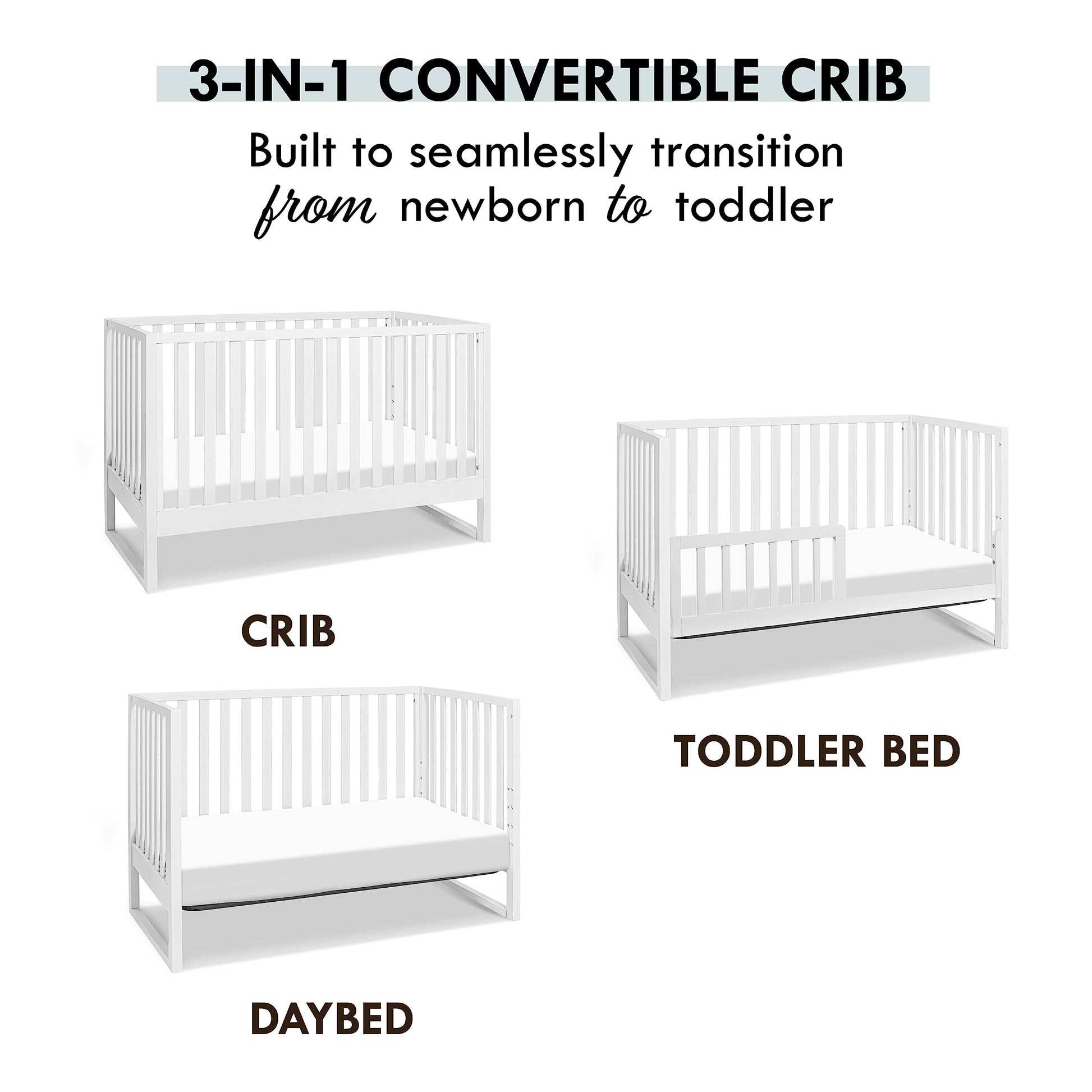 - Q: How does the convertibility feature work? A: The crib easily converts from a crib to a toddler bed and daybed, allowing it to grow with your child.