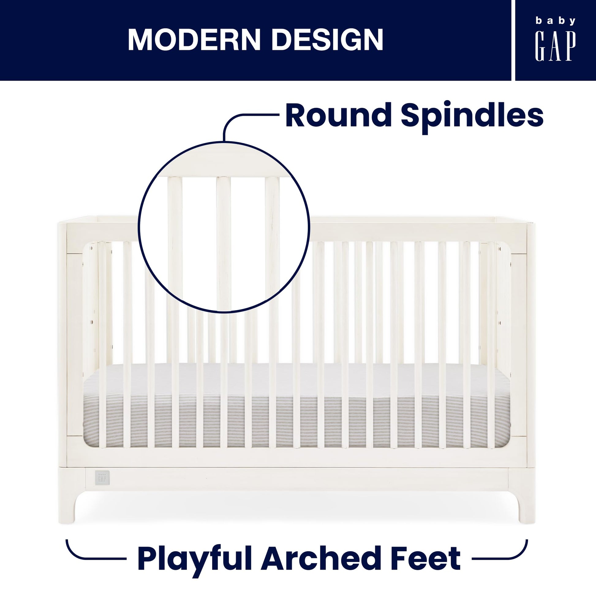 - Q: What color options are available for this crib? A: The Delta Children babyGap Wren 4-in-1 Convertible Crib is available in Antique White and Acorn finishes.