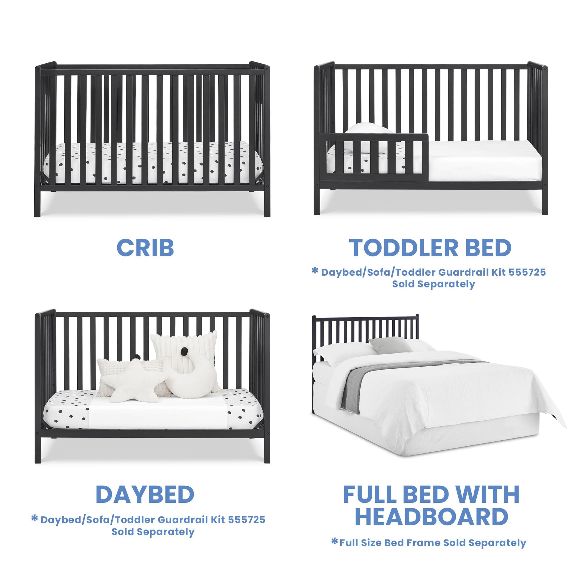 - Q: How does the crib convert to different bed types? A: This crib converts to a toddler bed, daybed, and a full size bed with headboard only. The Daybed/Toddler Guardrail Kit and standard metal bed frame for headboard only conversion are sold separately.