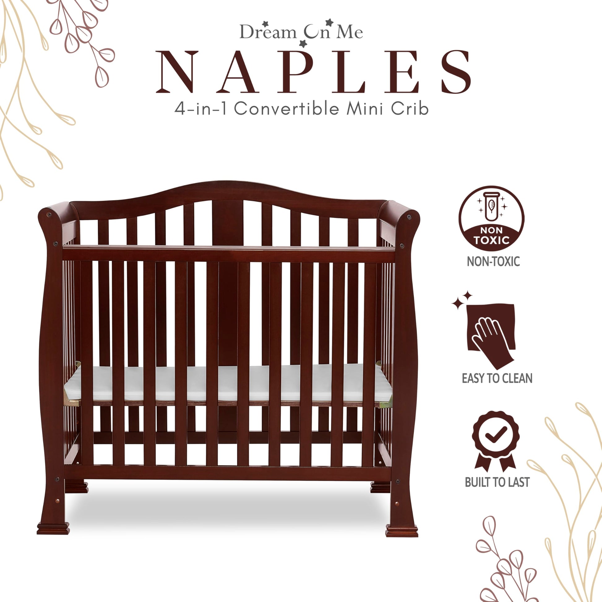 - Q: What are the dimensions of the Dream On Me Addison 4-in-1 Convertible Mini Crib? A: The dimensions of the Dream On Me Addison 4-in-1 Convertible Mini Crib are 38 inches long, 24 inches wide, and 32 inches high.