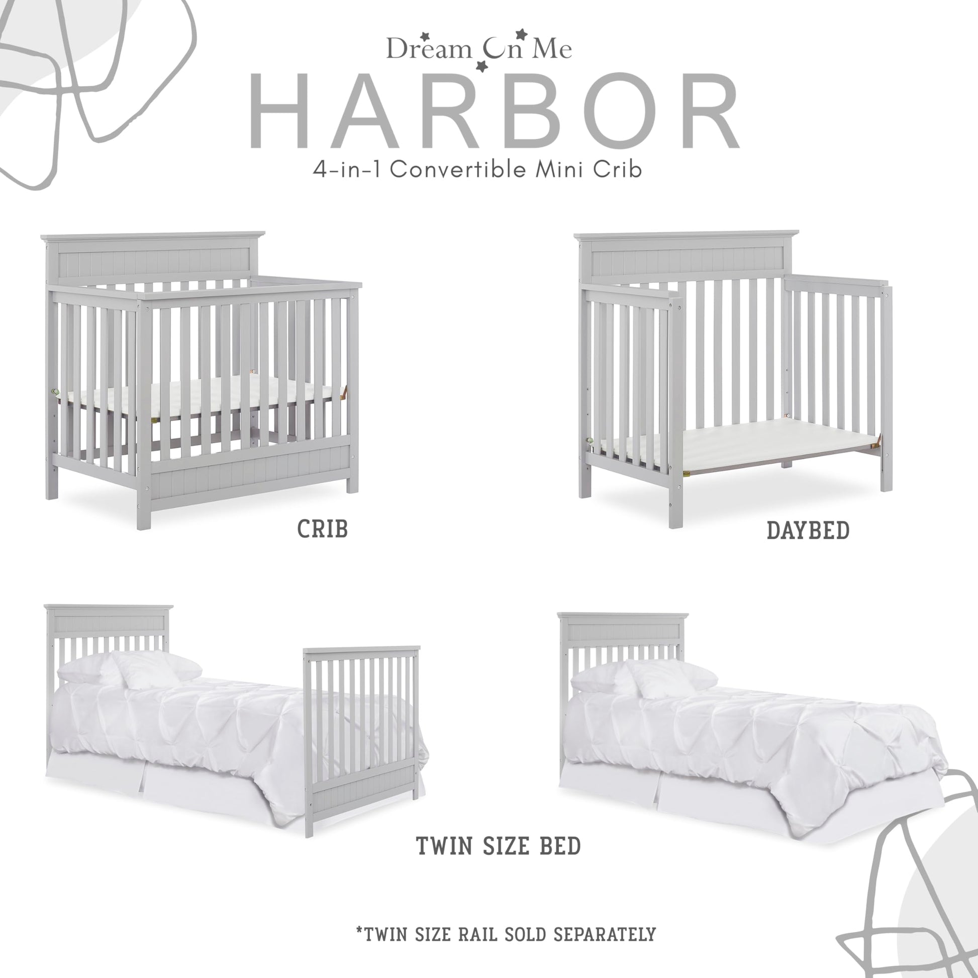 - Q: Can the crib be converted into different forms? A: Yes, the Harbor 4-in-1 Convertible Mini Crib can be converted into a crib, mini daybed, and twin-size bed, with bed rails sold separately.