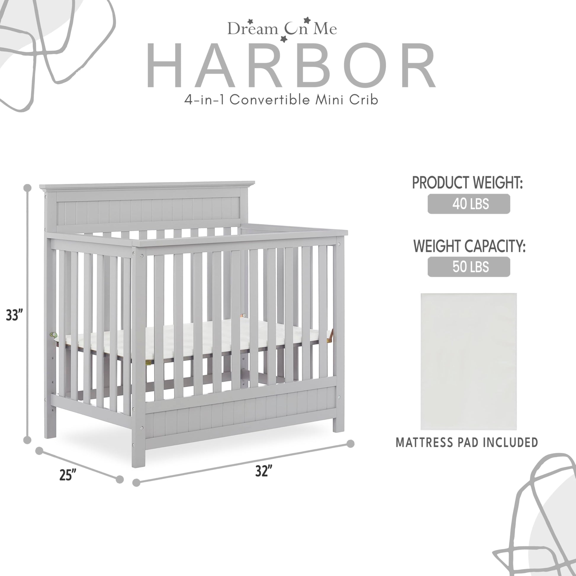 - Q: What are the dimensions of the Dream On Me Harbor 4-in-1 Convertible Mini Crib? A: The product dimensions are 39 inches in length, 28 inches in width, and 37 inches in height.