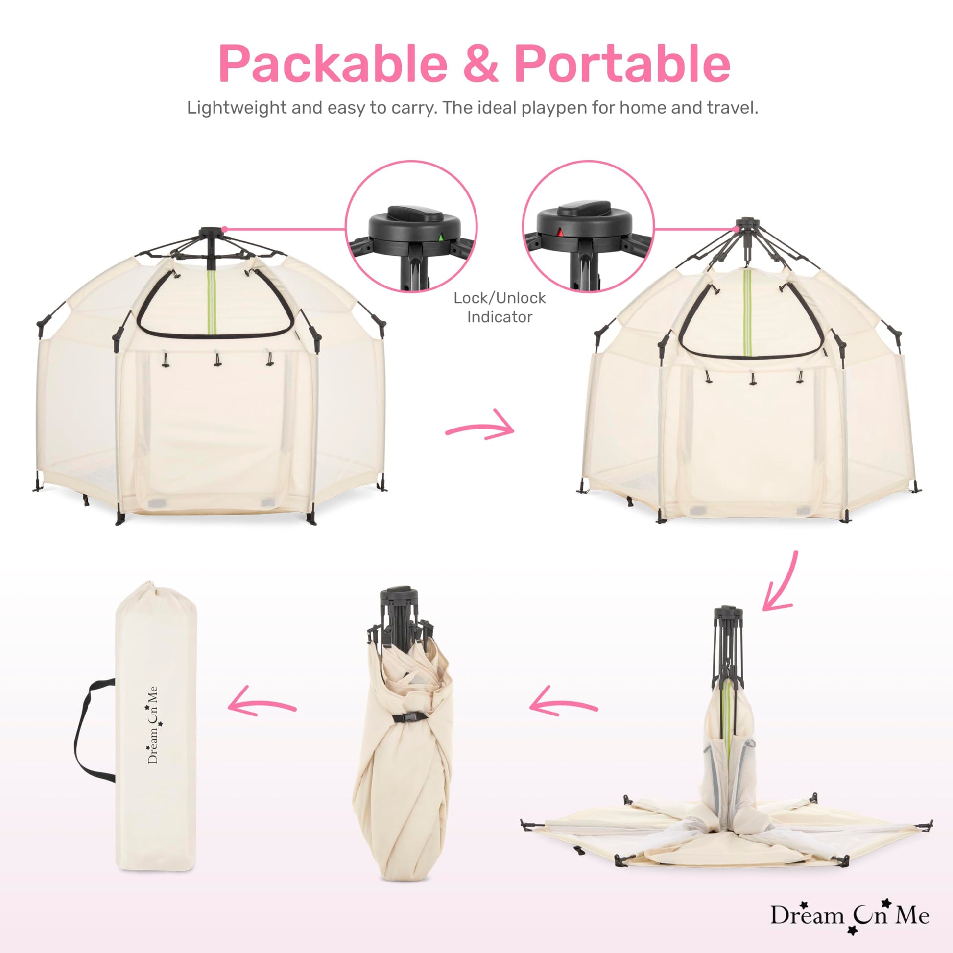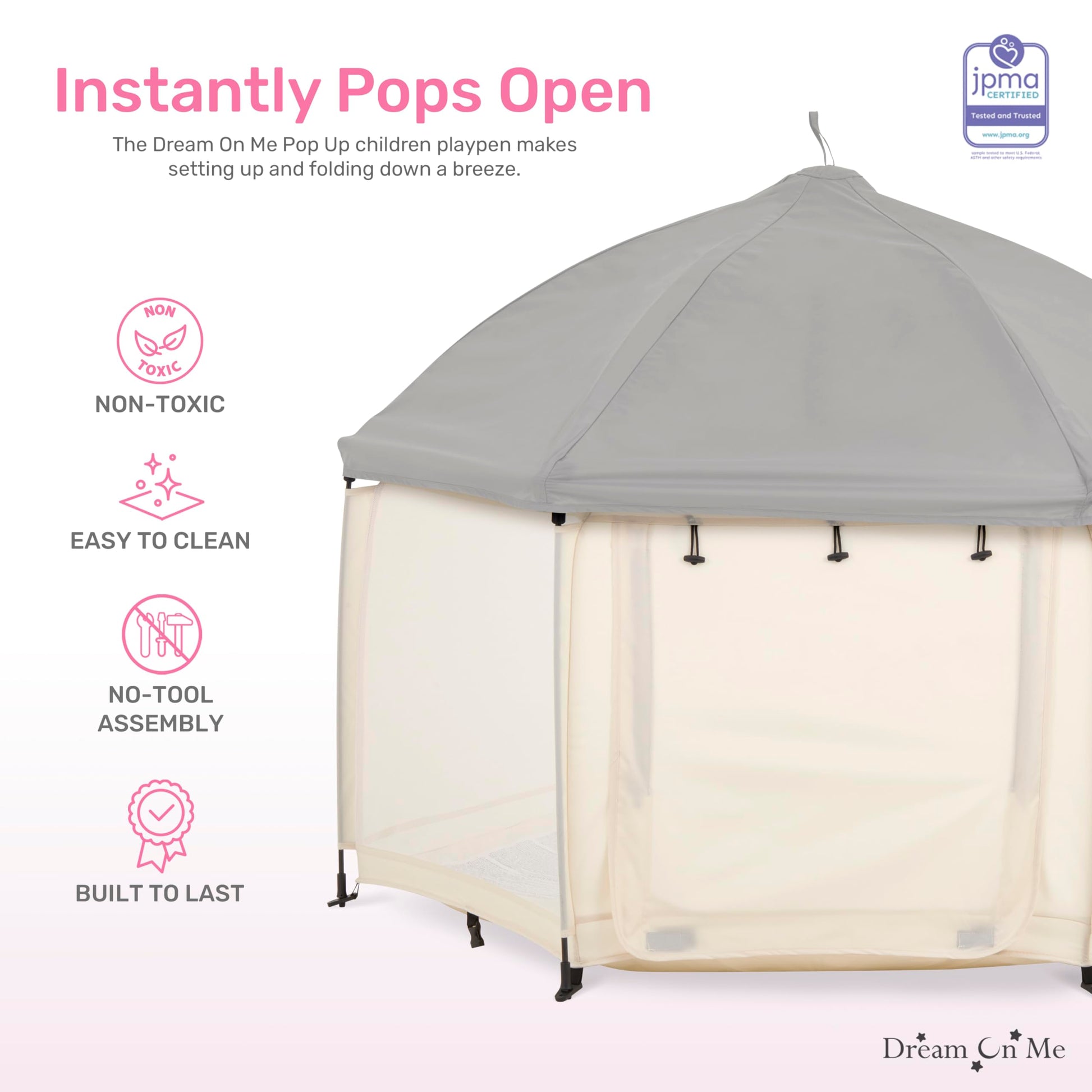 - Q: Does the playpen meet safety standards? A: Yes, the Dream On Me Pop Up Playpen meets and exceeds ASTM safety standards.