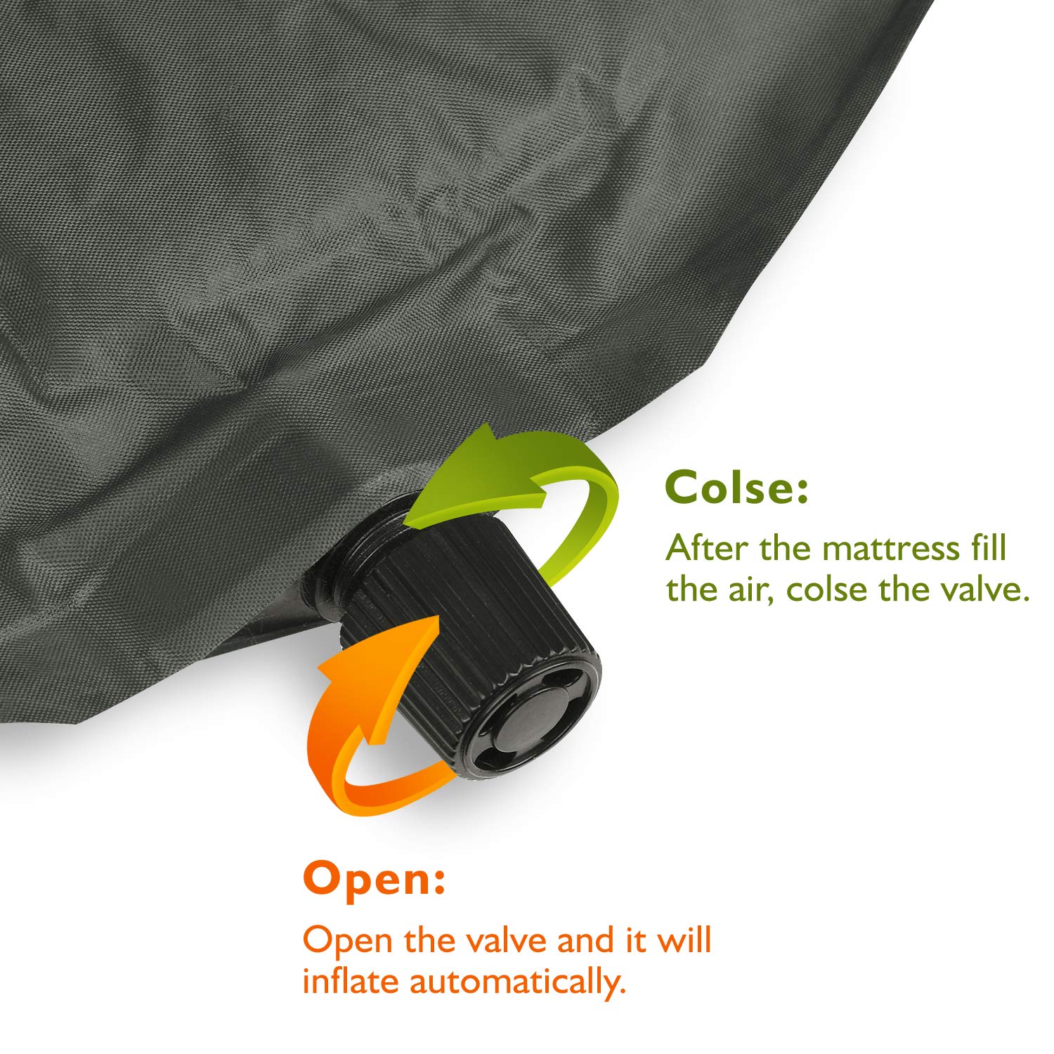 - Q: How does the self-inflating feature work? A: The self-inflating feature utilizes a free-flow valve that allows the mat to automatically inflate without the need for an air pump. Simply roll it out and open the valve.