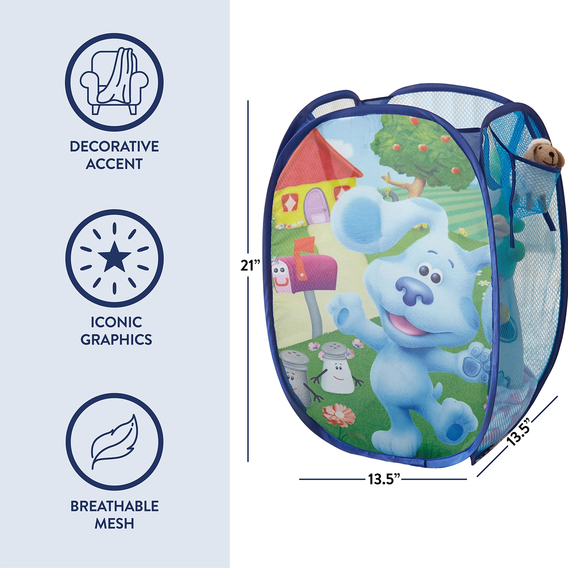 - Q: What are the dimensions of the Blues Clues pop up hamper? A: The hamper measures 21.5 inches in height, 13.5 inches in width, and 13.5 inches in length.