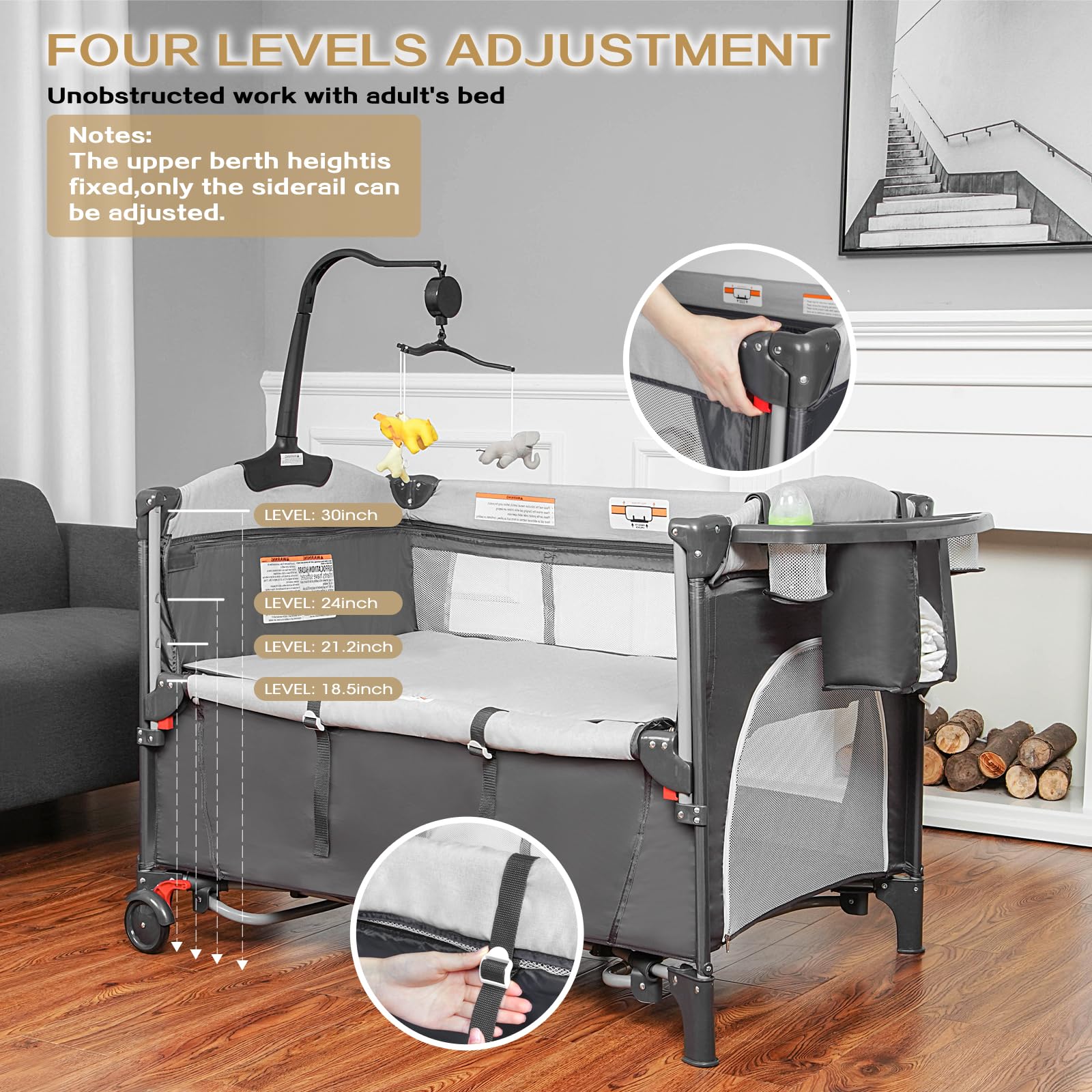 - Q: What features help soothe the baby during sleep? A: The bassinet includes a hanging toy with cute animal dolls that can emit sweet music, helping to soothe the baby and promote sleep.