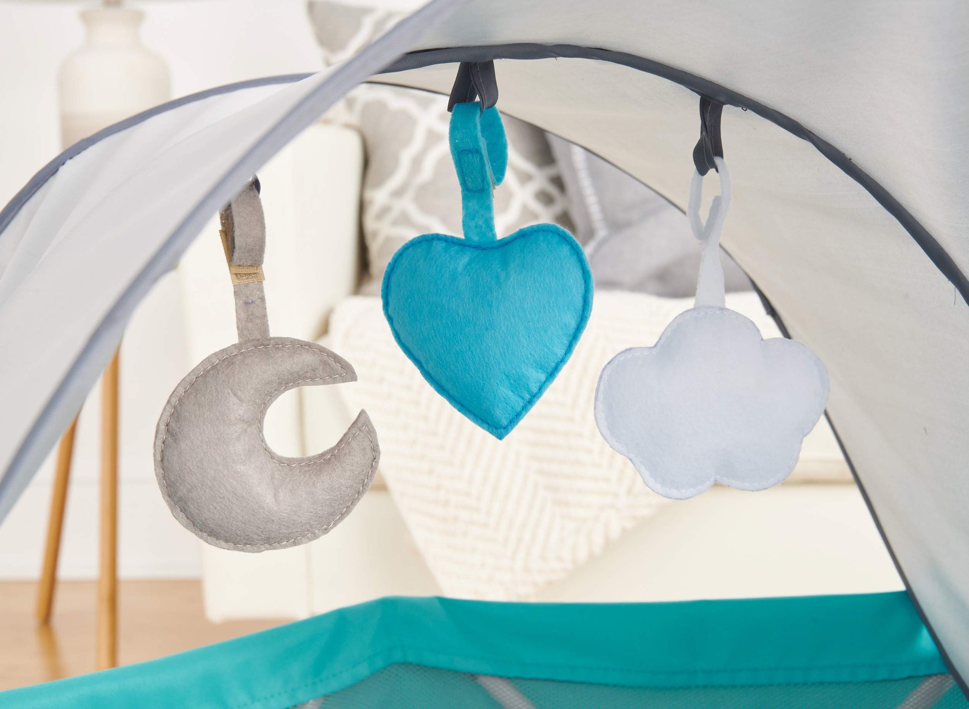 - Q: What toys are included with the play yard? A: The play yard includes removable sensory toys such as a moon, heart, and cloud that hang from the canopy.