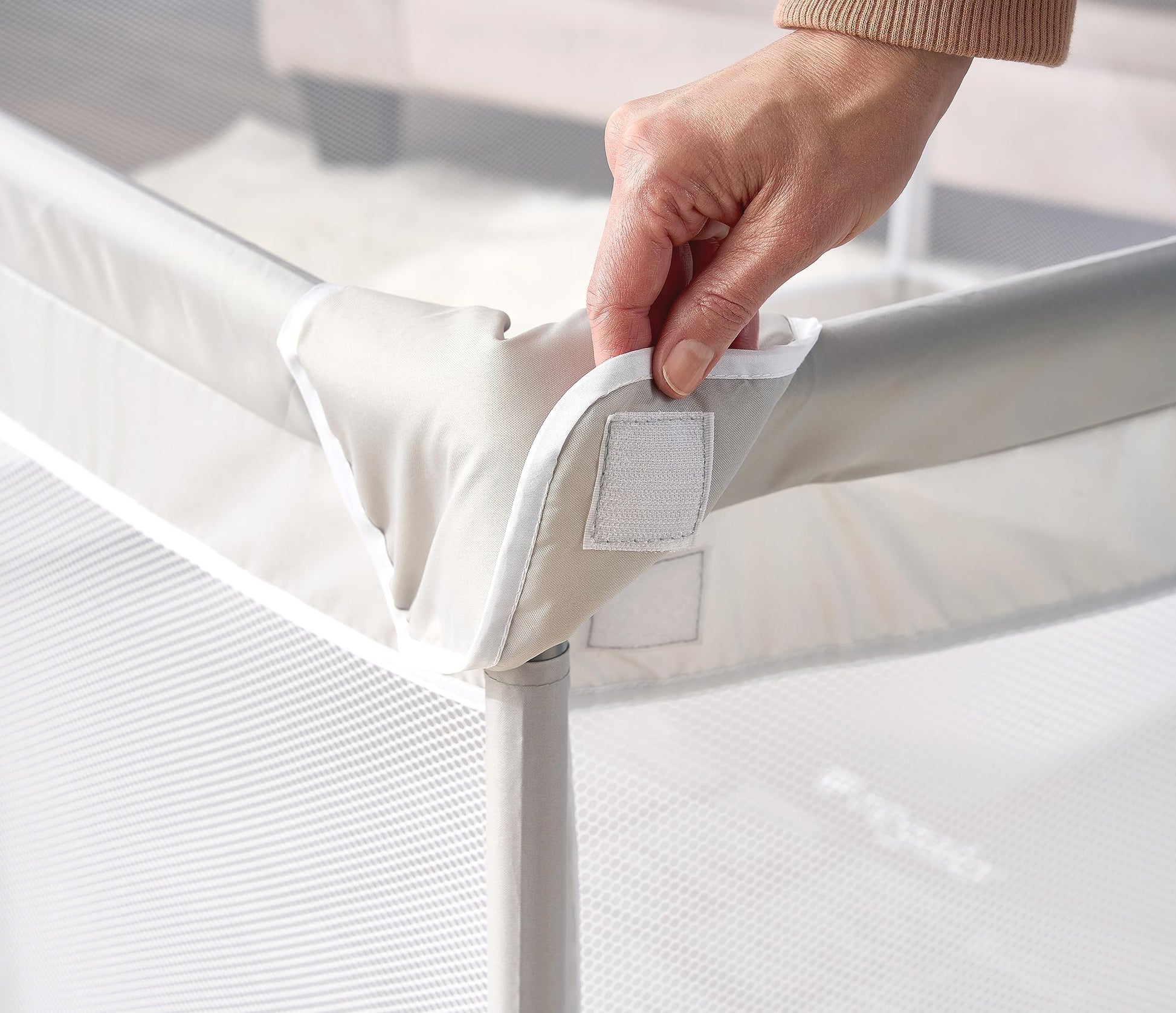 - Q: How does the playpen ensure my child’s safety? A: The playpen features a sturdy square frame with velcro fasteners to keep your child safe inside while preventing pets from entering.