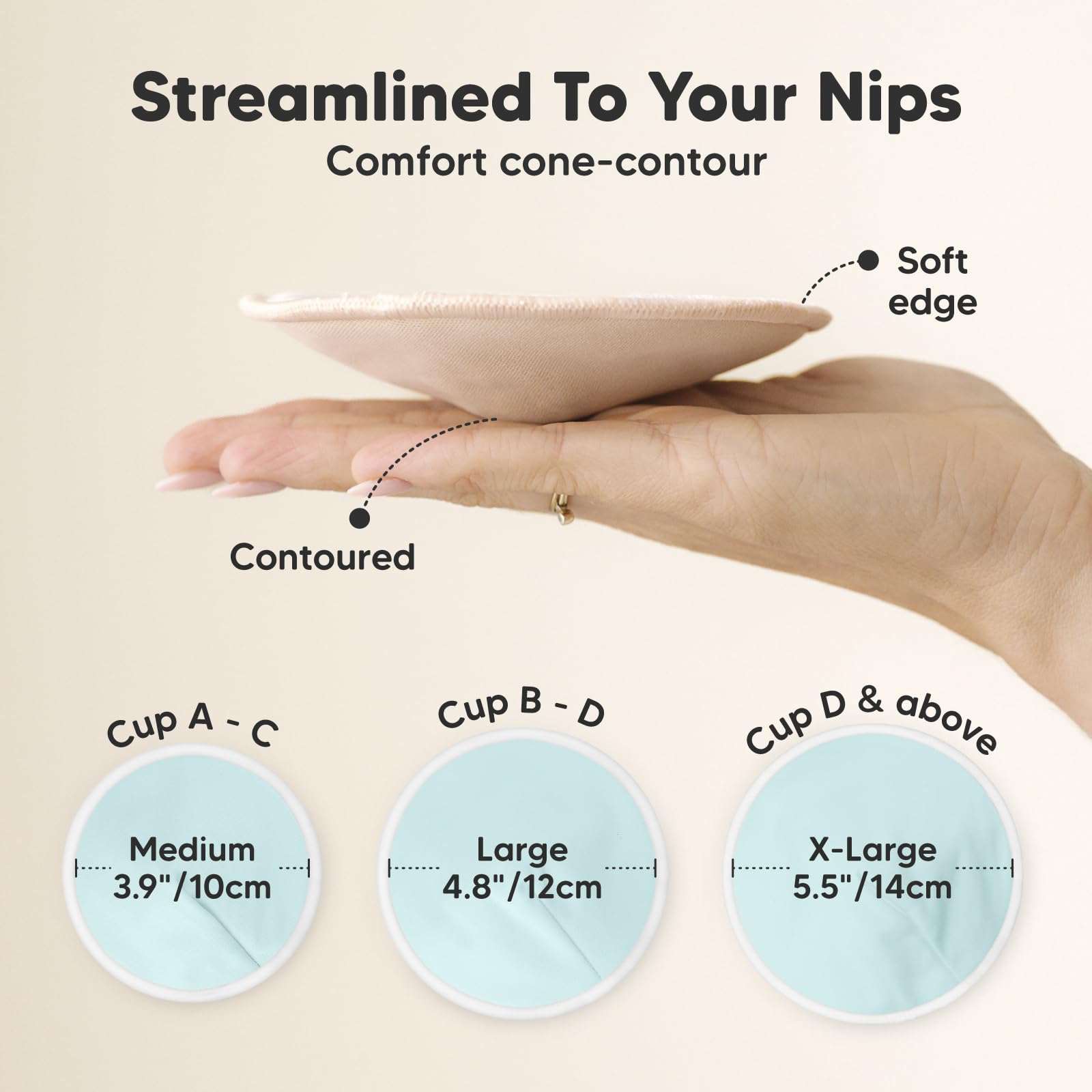 - Q: What sizes are available for the nursing pads? A: The nursing pads are available in three sizes: Medium at 3.9 inches for cup sizes A to C, Large at 4.8 inches for B to D cup, and X-Large at 5.5 inches for D cup and beyond.