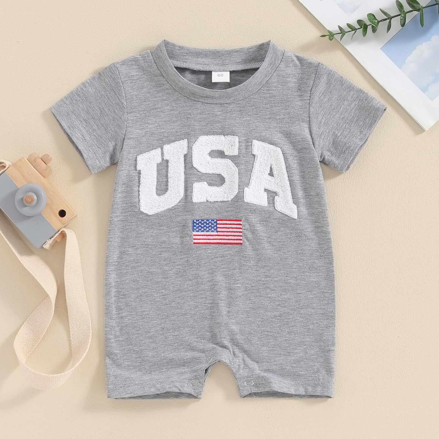 - Q: Does this romper have any special features? A: Yes, the romper features a chic and stylish design with fuzzy letter flag embroidery, making it a fun outfit for your baby's first Fourth of July.