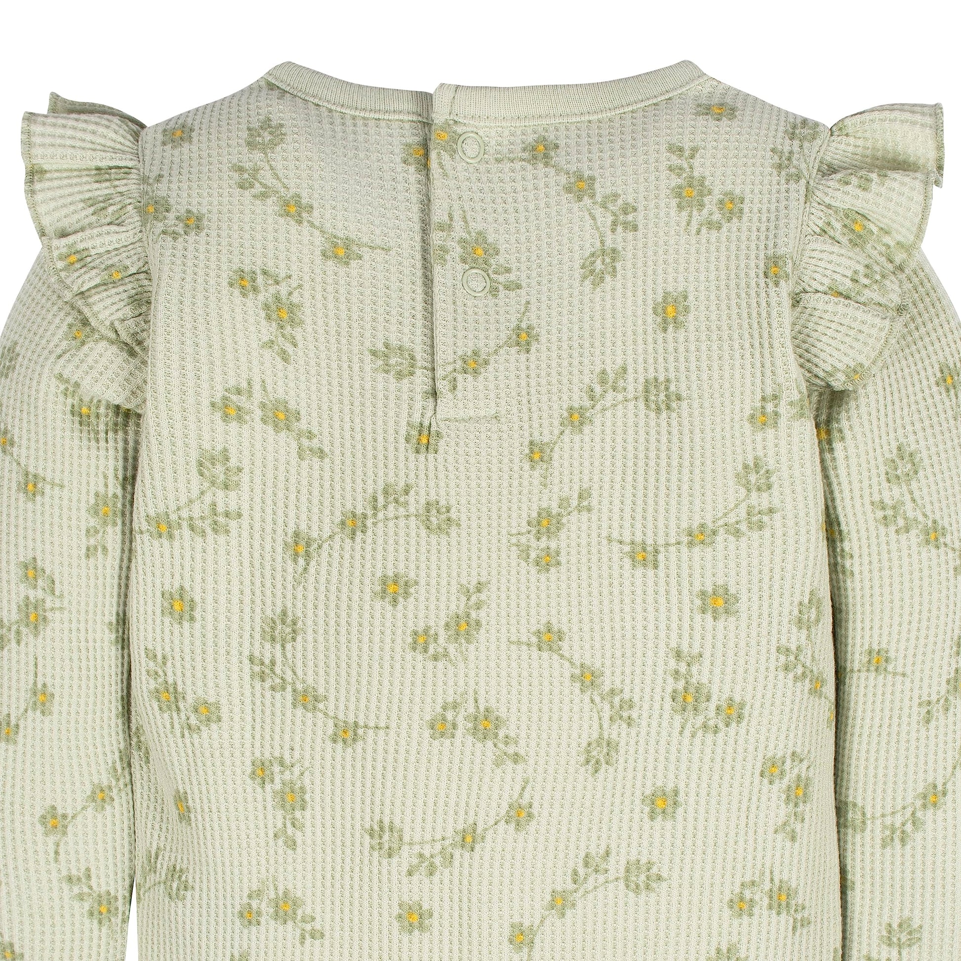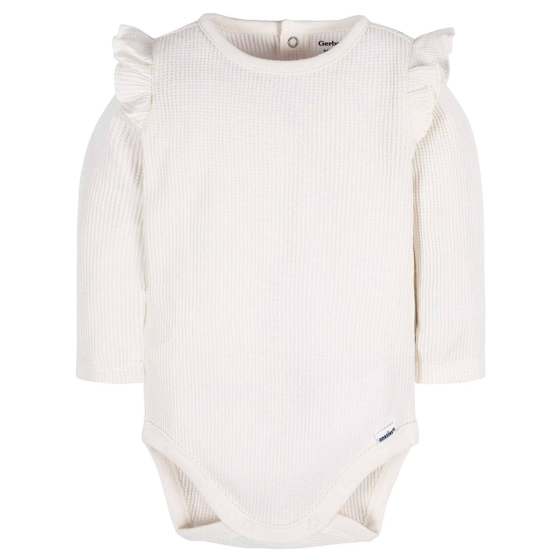 - Q: What is the design of the Gerber Baby Girl's Long Ruffle Sleeve Onesies? A: The design includes a solid ivory bodysuit and a green bodysuit featuring a flower pattern, providing a mix of classic and playful styles.