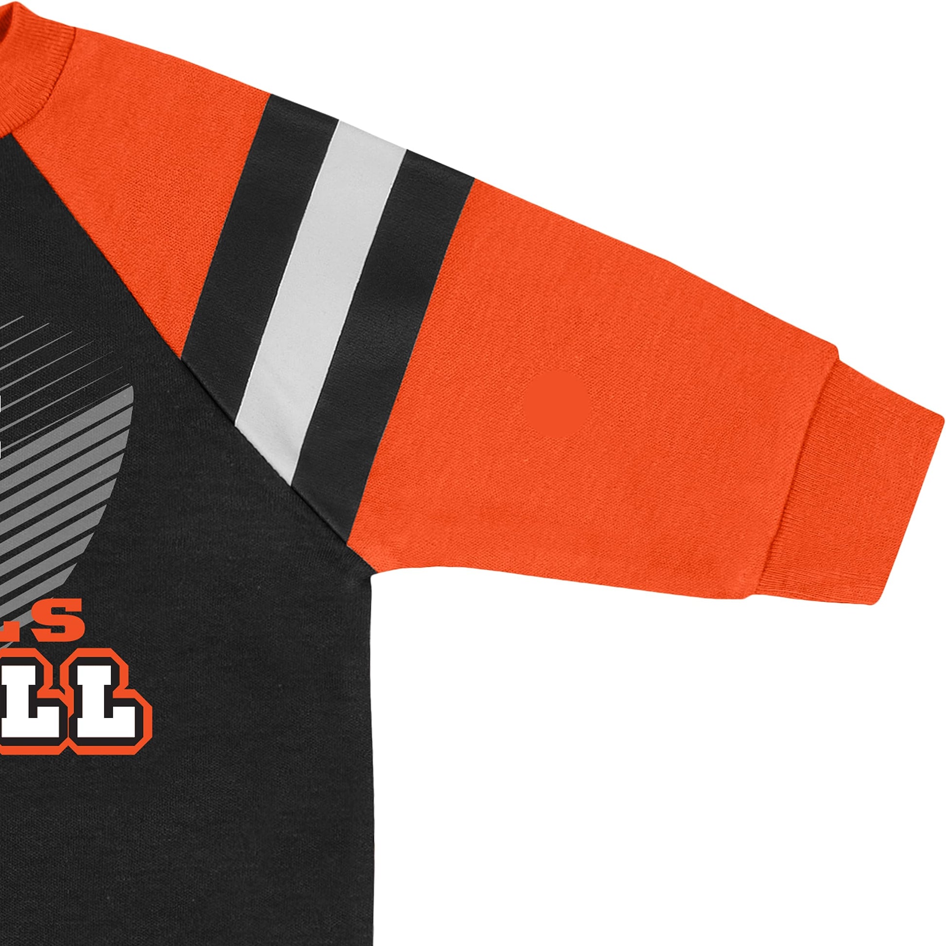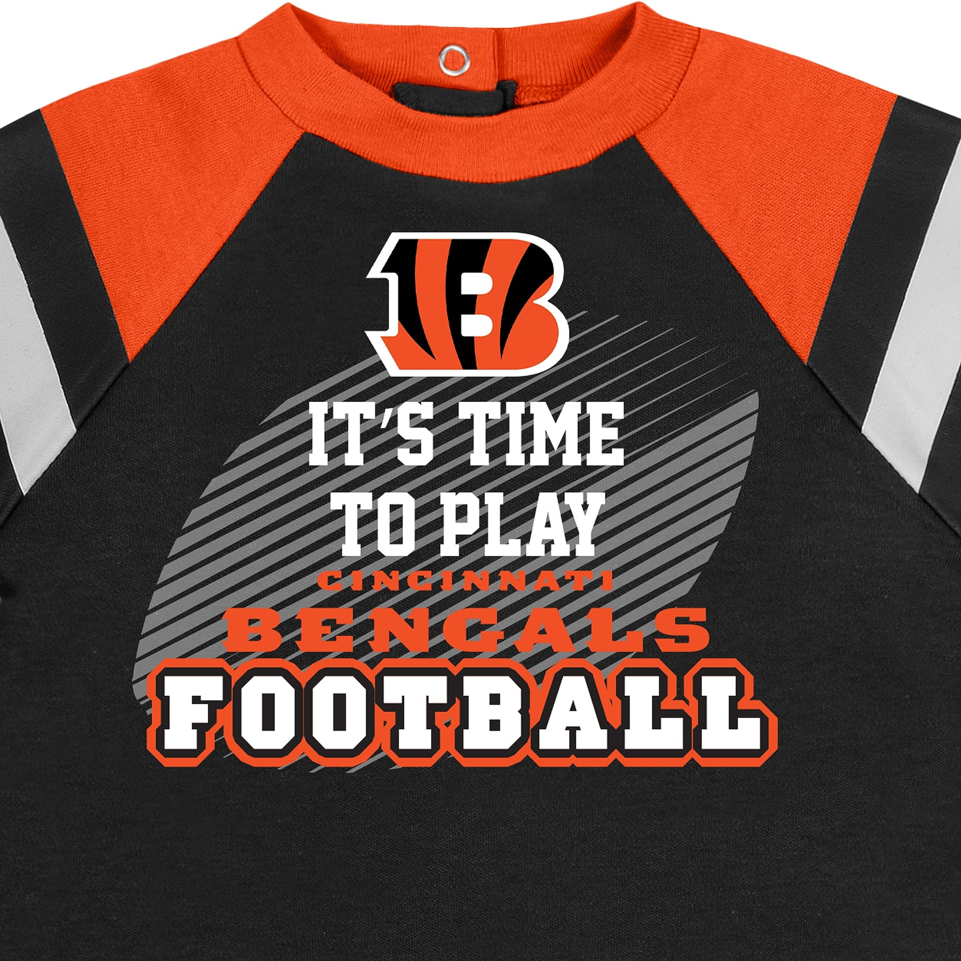 - Q: What design features does this outfit have? A: It includes team colors with screen print and puff print of the Bengals logo along with the phrase 'It's time to play football!'