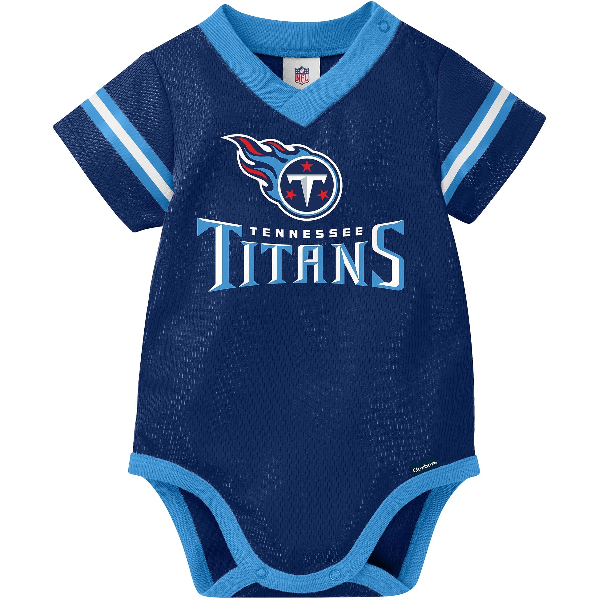 - Q: What teams does this jersey represent? A: This jersey bodysuit features team colors and a screen print logo for the Tennessee Titans.