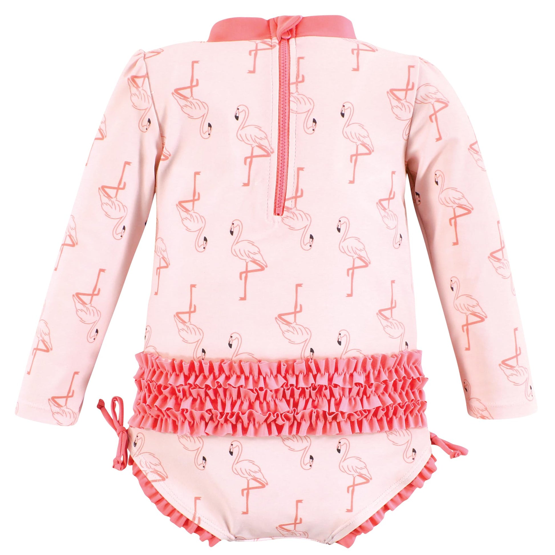 - Q: Does the swimsuit have a playful design? A: Yes, the swimsuit features a playful and colorful pink flamingo design that adds fun to any summer outing.