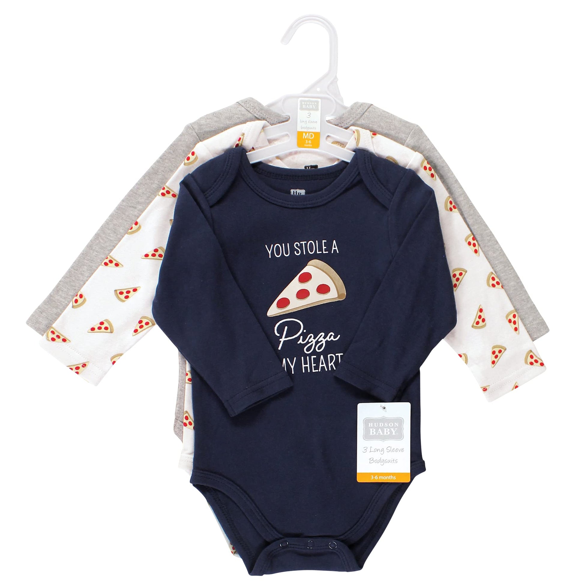 - Q: What designs do the bodysuits feature? A: The Hudson Baby bodysuits come with adorable prints, embroideries, stripes, and solids.