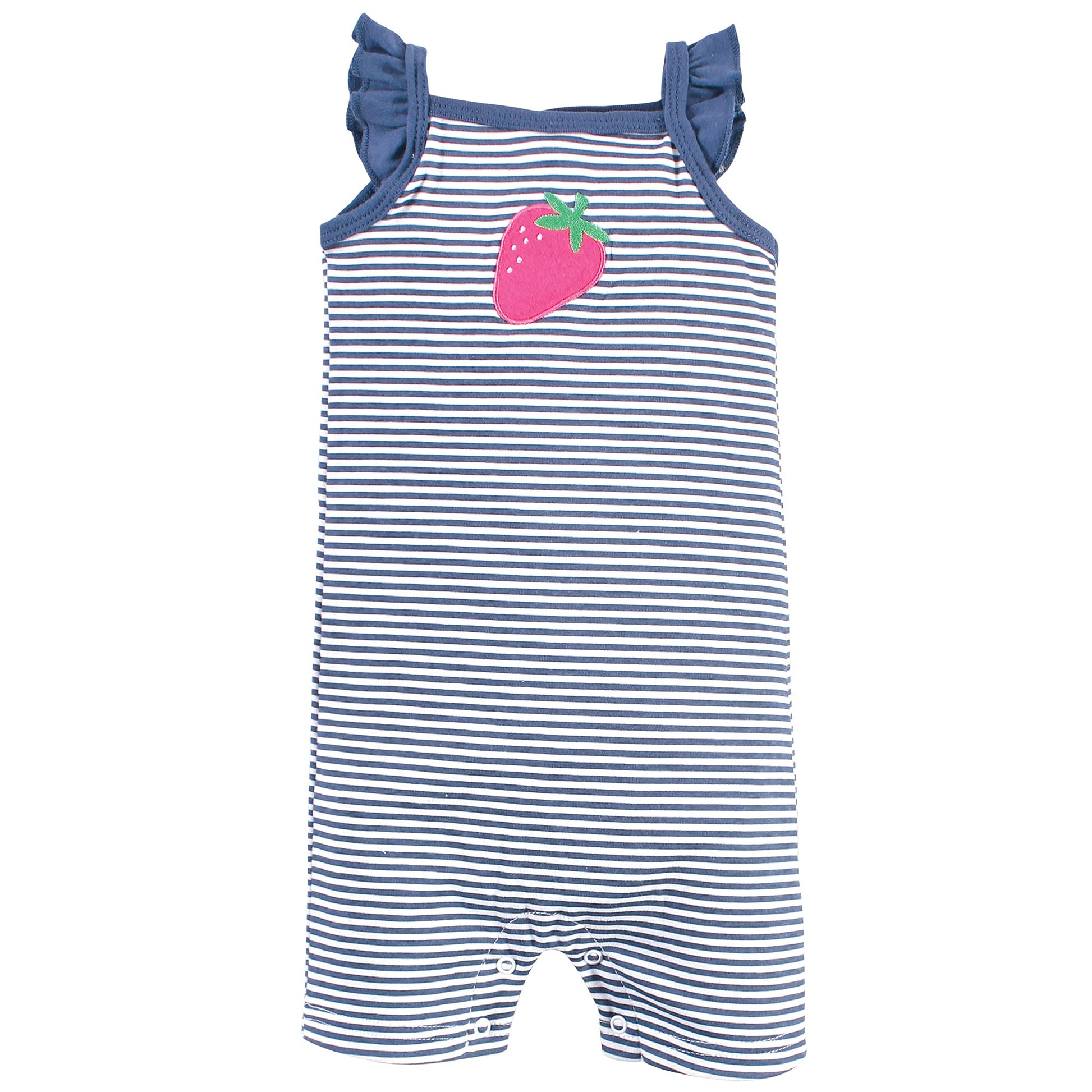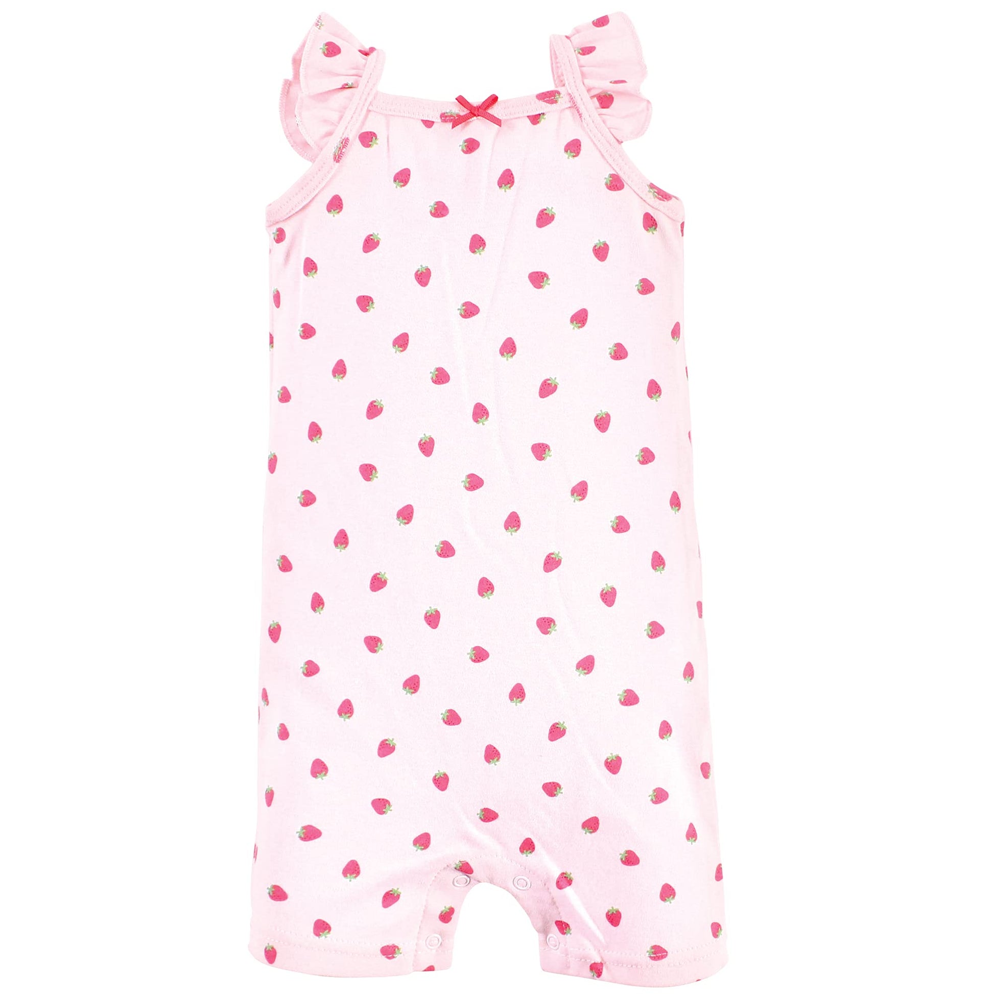 - Q: What designs are available for these rompers? A: The Hudson Baby Cotton Rompers feature fun and trendy designs, including a pink strawberry motif.