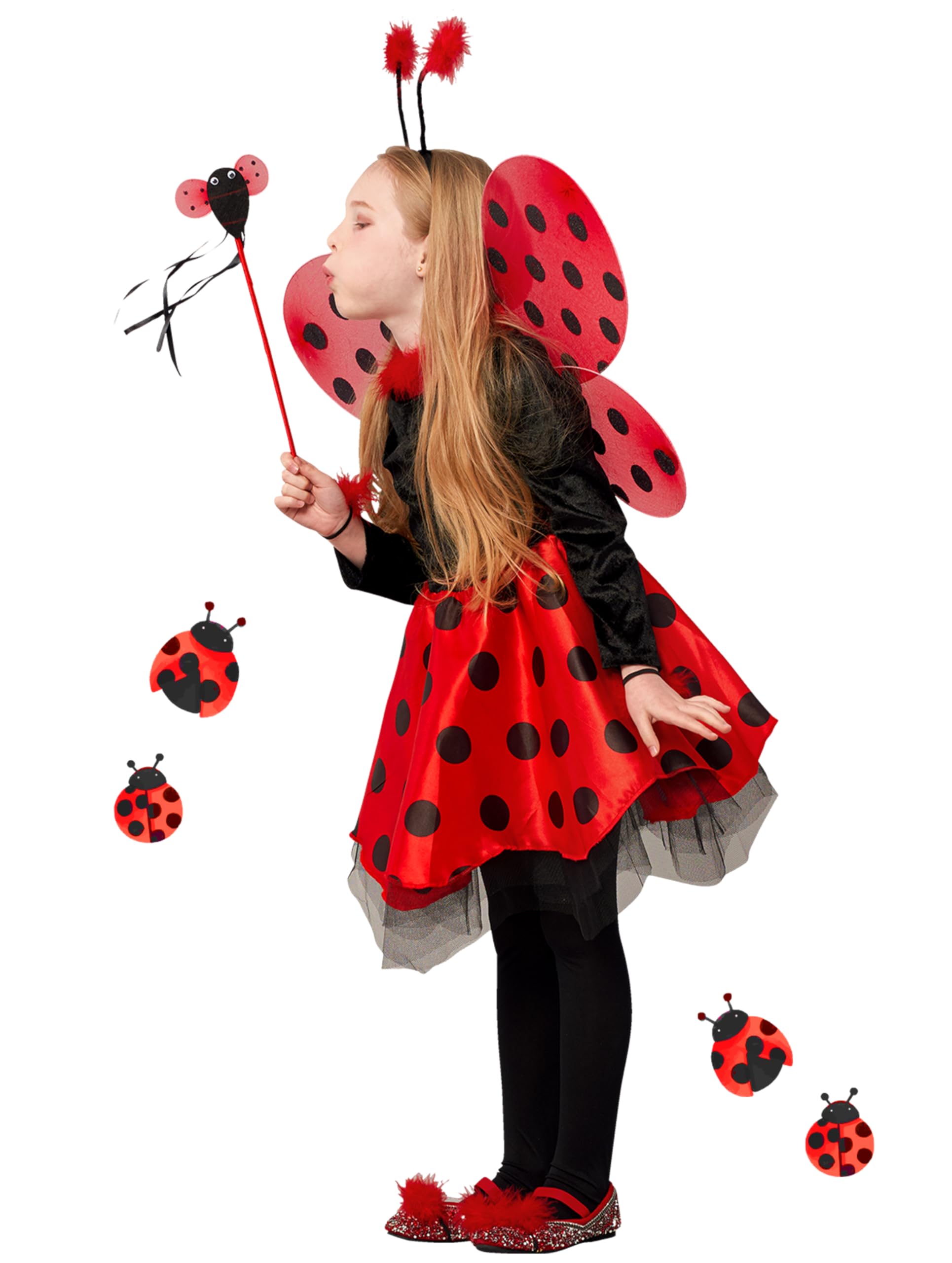 - Q: What does the 10-piece set include? A: The 10-piece set includes a polka dot dress, ladybird wings, a headband, a wand, a neck-piece, black leggings, two shoe puffs, and two hand-pieces.