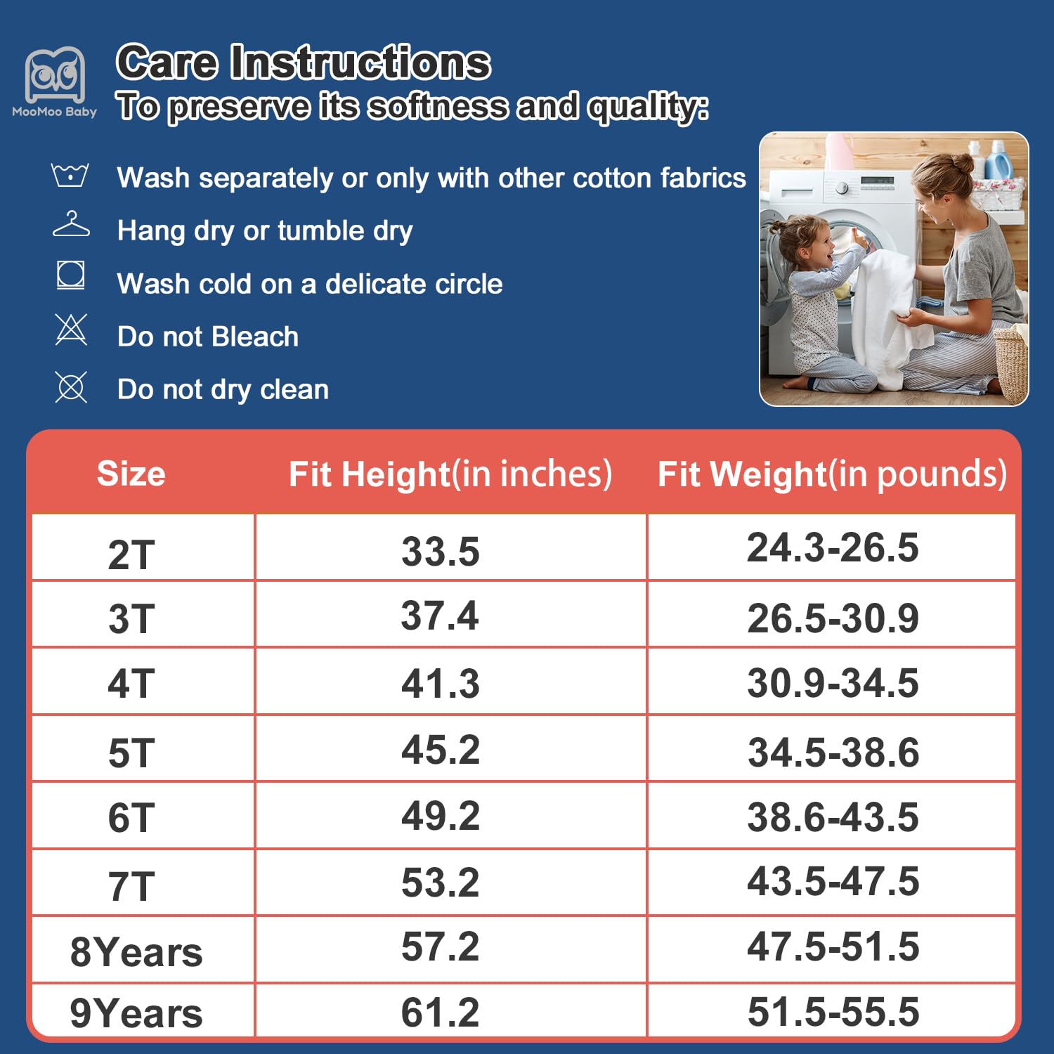 - Q: What sizes are available for the MooMoo Baby Training Underwear? A: The training underwear is available in various sizes: 2T (waist 13.4 inches, height 33.5 inches, weight 24.3-26.5 lbs), 3T (waist 14.2 inches, height 37.4 inches, weight 26.5-30.9 lbs), 4T (waist 15 inches, height 41.3 inches, weight 30.9-34.5 lbs), 5T (waist 15.8 inches, height 45.2 inches, weight 34.5-38.6 lbs), 6T (waist 16.6 inches, height 49.2 inches, weight 38.6-43.5 lbs), and 7T (waist 17.4 inches, height 53.2 inches, weight 43.5-47.5 lbs).