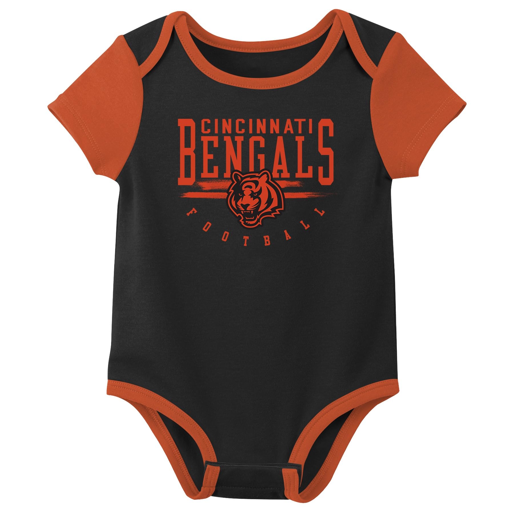 - Q: How many bodysuits are included in the pack? A: The pack includes three unique bodysuits, each featuring different Cincinnati Bengals team logos and colors.
