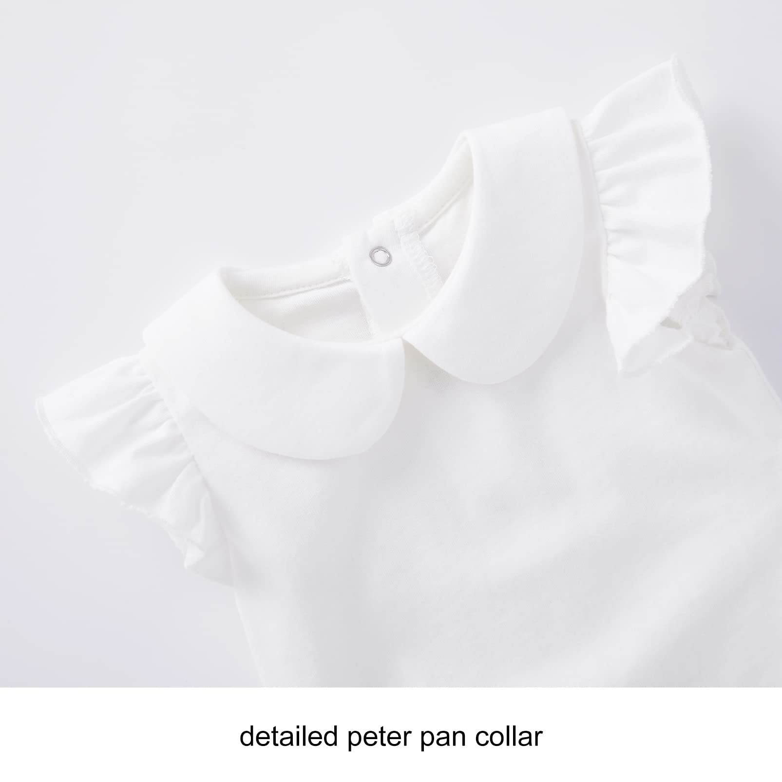 - Q: Does the bodysuit have any special design features? A: Yes, the bodysuit features an adorable peter-pan collar and short ruffle sleeves, giving it a stylish and charming look.