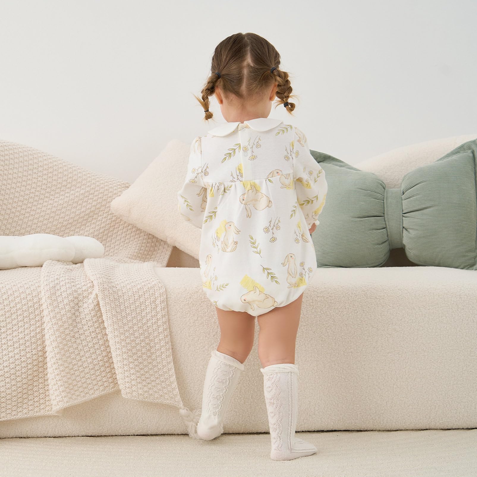 - Q: Does the bodysuit have any special design elements? A: Yes, it features an adorable allover bunny print and a classic Peter Pan collar that adds charm to the outfit.