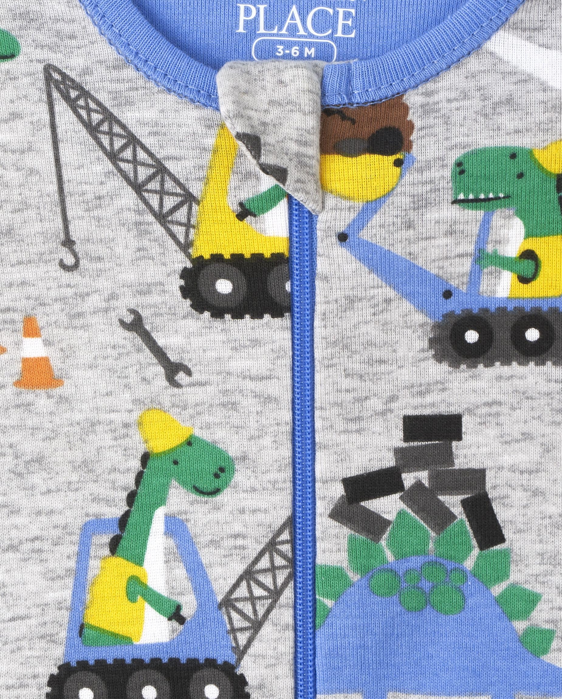 - Q: What kind of design do the pajamas have? A: The pajamas feature long sleeves, a rib-knit crew neck, and an allover dino construction vehicle print, along with attached footies.
