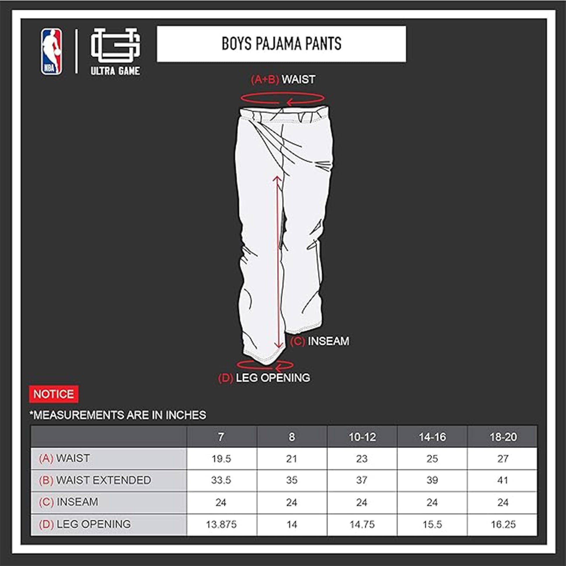 • Q: What is the design of the bottoms in the Ultra Game NBA Youth Pjs set? A: The bottoms of the Ultra Game NBA Youth Pjs set feature an all-over print with the team's primary and secondary logos, showcasing team pride.