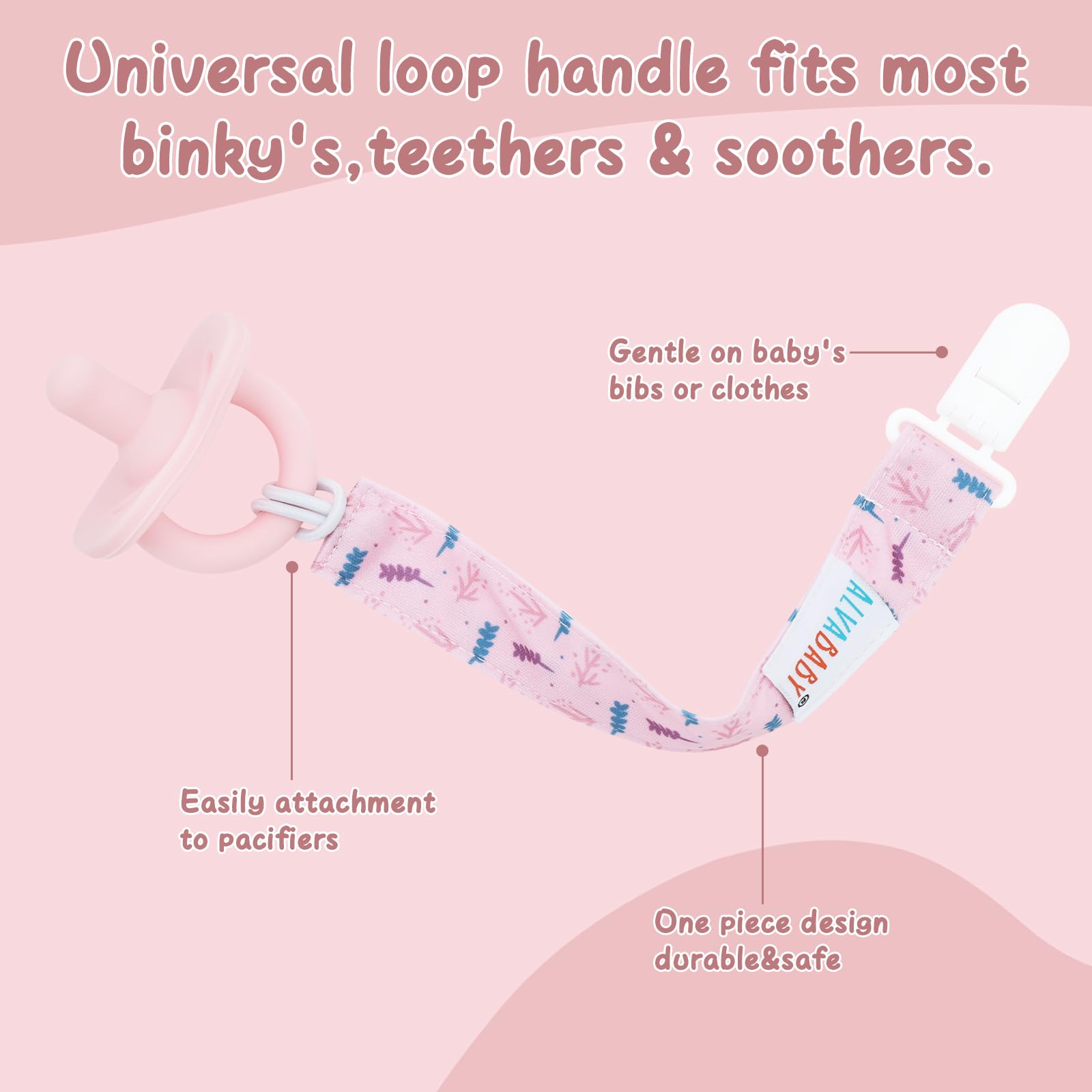 Material-ALVABABY baby pacifier clip leash are made of polyester fabric,plastic clip,nylon rope.Paci clip strap is a universal pacifier clip leash designed with a loop to be compatible with all types of teethers,toys,babies of all ages that newborn,infants,toddler.Pacifier clip holder helps a crawling baby keep their pacifier from dragging on the dirty ground.Safety-Pacifier clips with plastic teeth hold tight and will hardly damage baby's clothes or discomfort the baby,but please do not let your baby chew on the clips to avoid a choking hazard.They are BPA free,phthalate free,latex free,lead free and CPSIA certified,pacifier clip holder are washable,durable and soft.Multifunctional Usage: pacifier leashes are usually used for any soothies,burp cloths,teether toys,teething rings,Nuks,MAMs,baby blankets,baby drool bibs,strollers,play gyms and car seats.It is an universal pacifier clip and fits to your favorite brand of pacifier and soother.Unique Design-We have many different designs and pattern:such as floral,fruit,rainbow,cute animals,solid colors,Halloween and Christmas,pacifier clip holder straps fit for baby boy and girl.chains clips work with most of the styles that have a ring part on it.8 pieces of plastic pacifier clips holders with a box(No pacifier included).