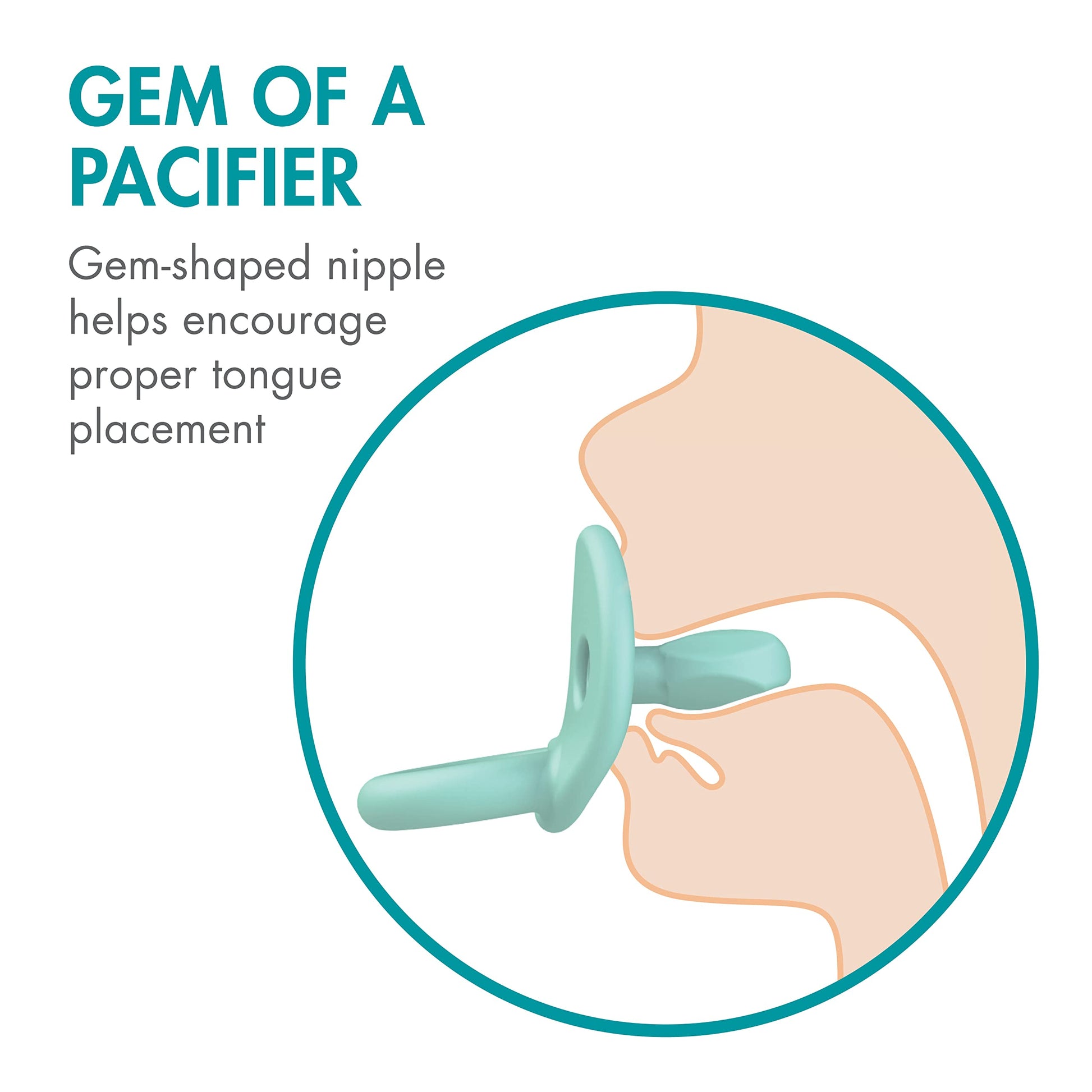 - Q: How does the gem-shaped nipple benefit my baby? A: The gem-shaped nipple helps encourage proper tongue placement, promoting a more comfortable sucking experience and supporting natural oral muscular development.