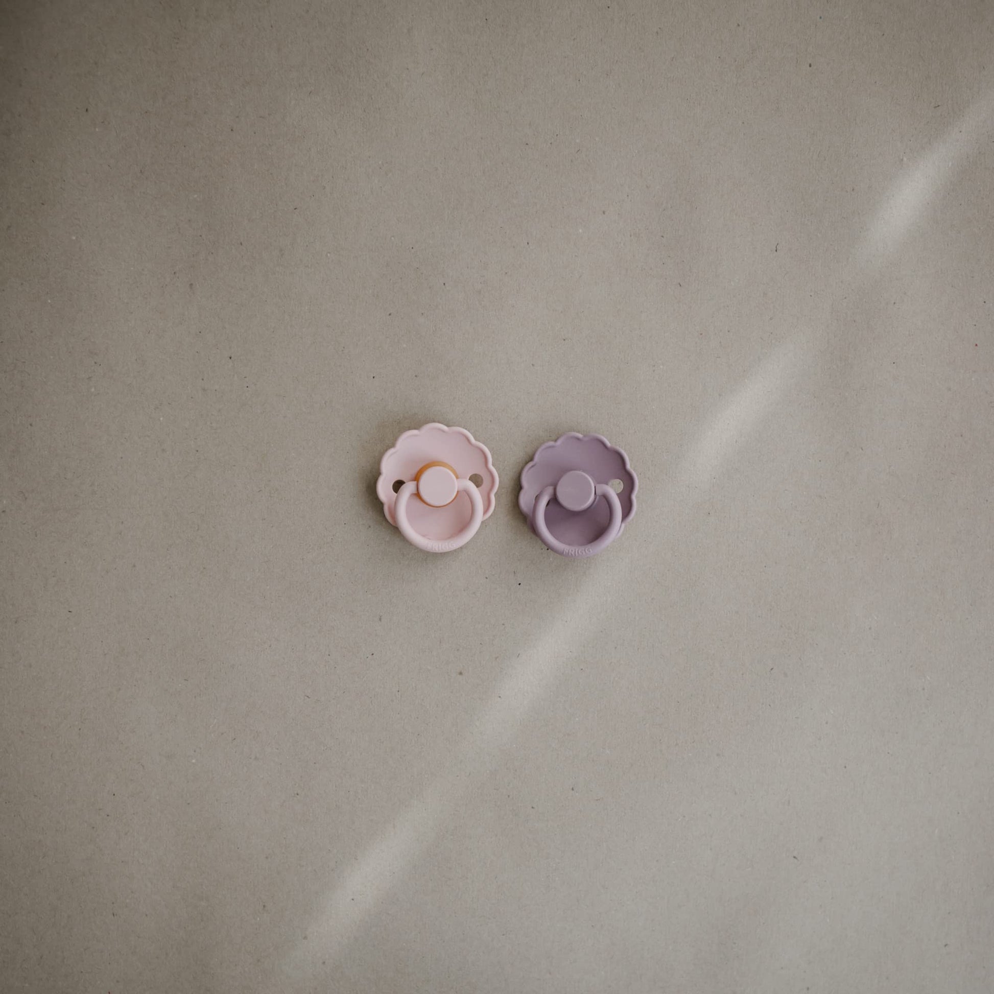 - Q: How many pacifiers are included in the pack? A: The pack includes two pacifiers in soft lilac and baby pink colors.