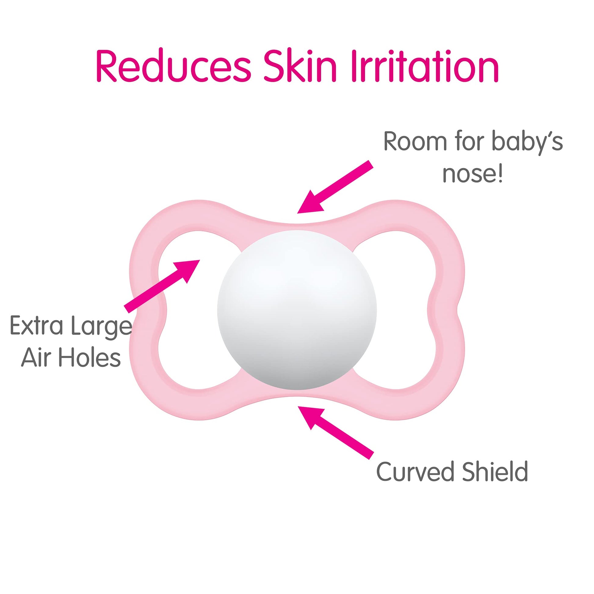 - Q: How does the design help with my baby's sensitive skin? A: The pacifier features large open air holes that allow maximum airflow, helping to prevent skin irritation.