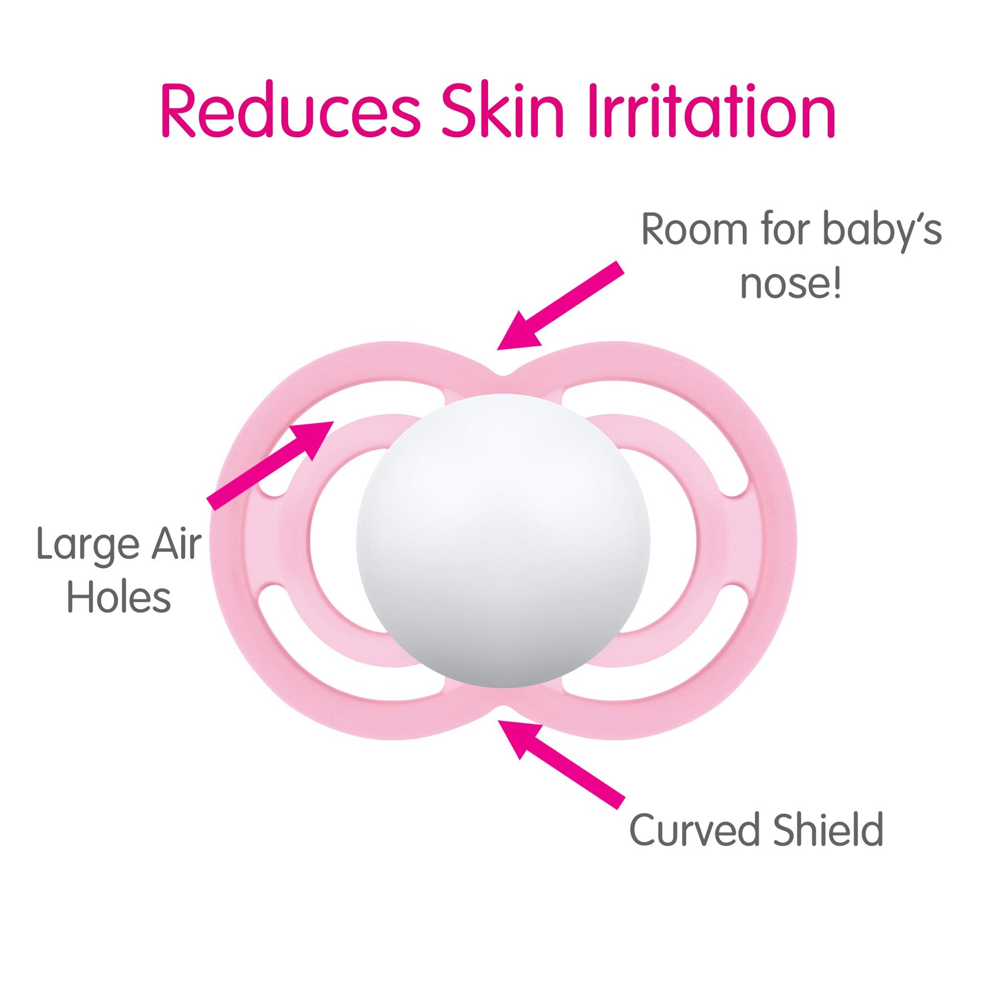 - Q: How does the flexible design benefit my baby? A: The pacifier's SkinSoft nipple is 60% thinner and 4 times more flexible than average, providing a comfortable fit and reducing pressure on your baby's mouth.