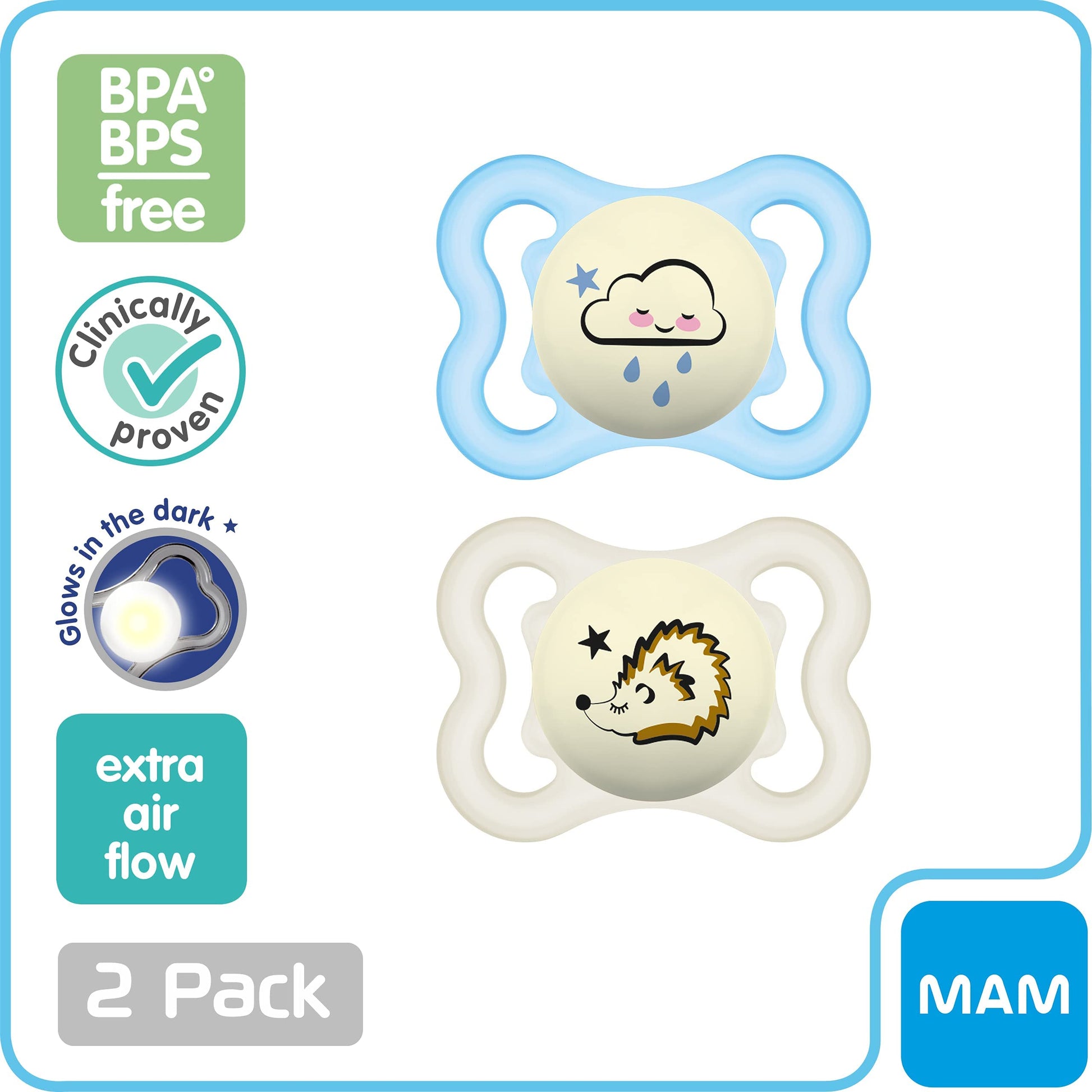 The MAM Supreme Night Pacifier for 0-6 months combines MAM's most beloved features. First, the nipple puts less pressure on babies' jaws and teeth and is 60% and 4x more flexible** than a regular pacifier. It is clinically proven* to reduce the risk of open bite and increased overbite later in life. Second, the wide openings on the pacifier shield create maximum air flow to protect baby's sensitive skin and prevent irritation. Third, these glow in the dark pacifiers helps keep baby's pacifier in sight. MAMs medically engineered nipples feature life-like, SkinSoft textured silicone that feels more natural. Use the included self-sterilizing storage case to disinfect the pacifiers for up to 48 hours. Fill case with water, place pacifier in the case with the nipple facing down and follow package instructions for microwave setting. Cool completely before use. *Y. Wagner, R. Heinrich-Weltzien, Effect of a thin-neck pacifier on primary dentition: a randomized controlled trial , Orthodontics & Craniofacial Research, Vol. 19, Issue 3, pp. 127-136, August 2016.**Wild Hi-Precision Institute: the MAM nipple neck is approx. 60% thinner; University Clinic of Dentistry Vienna: approx. 4x more flexible than other pacifiers. (32% - 83% thinner / 1.1 - 19.5x more flexible).
