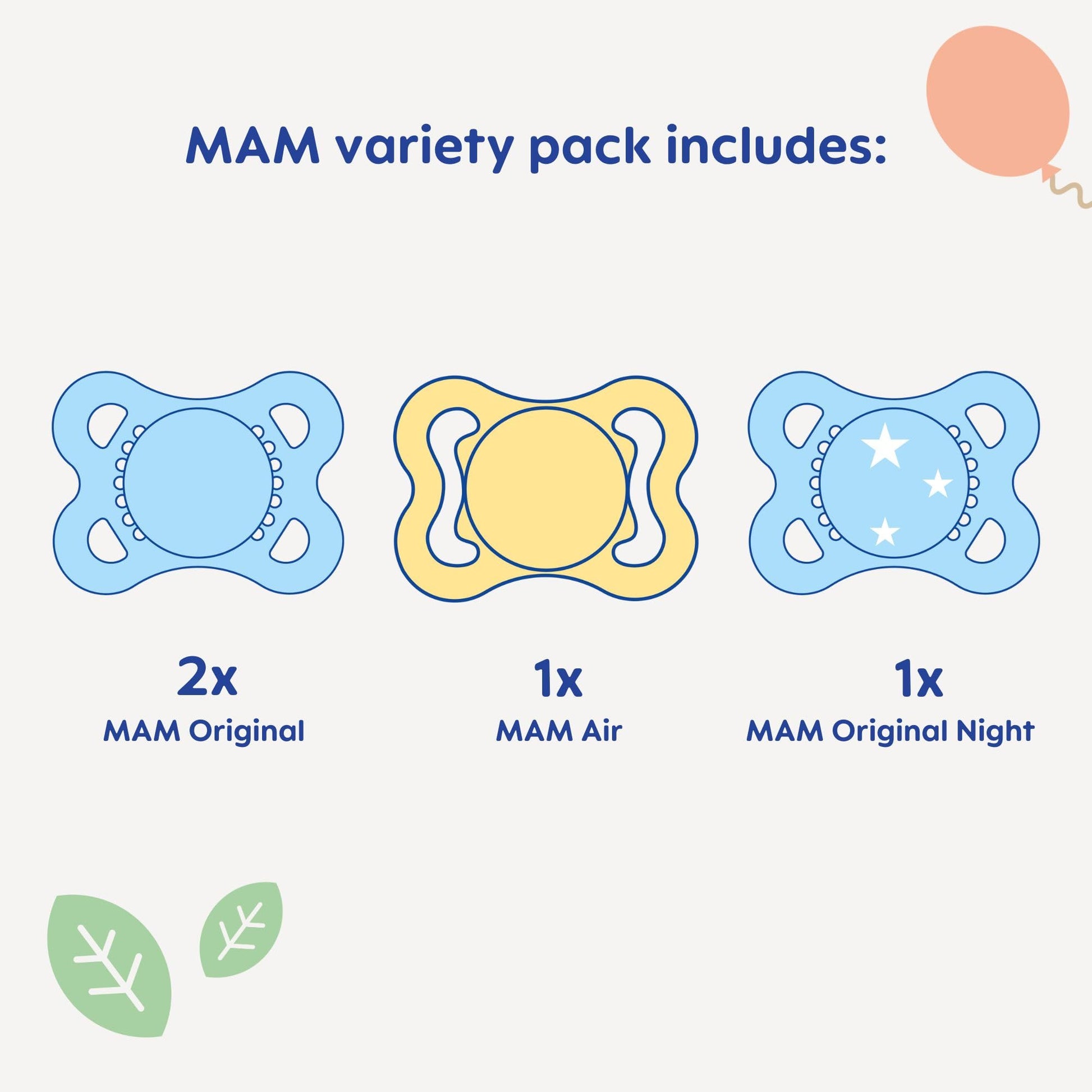 • Q: How many pacifiers are included in the MAM variety pack? A: The MAM Variety Pack includes a total of 4 pacifiers, featuring 3 different types.