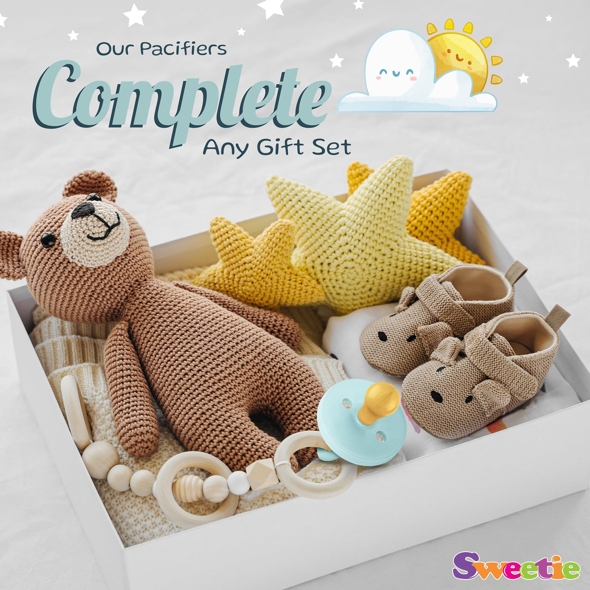 - Q: Does the SWEETIE Rubber Pacifier come in different sizes? A: Yes, the SWEETIE Rubber Pacifier is available in three sizes to accommodate the needs of growing babies.