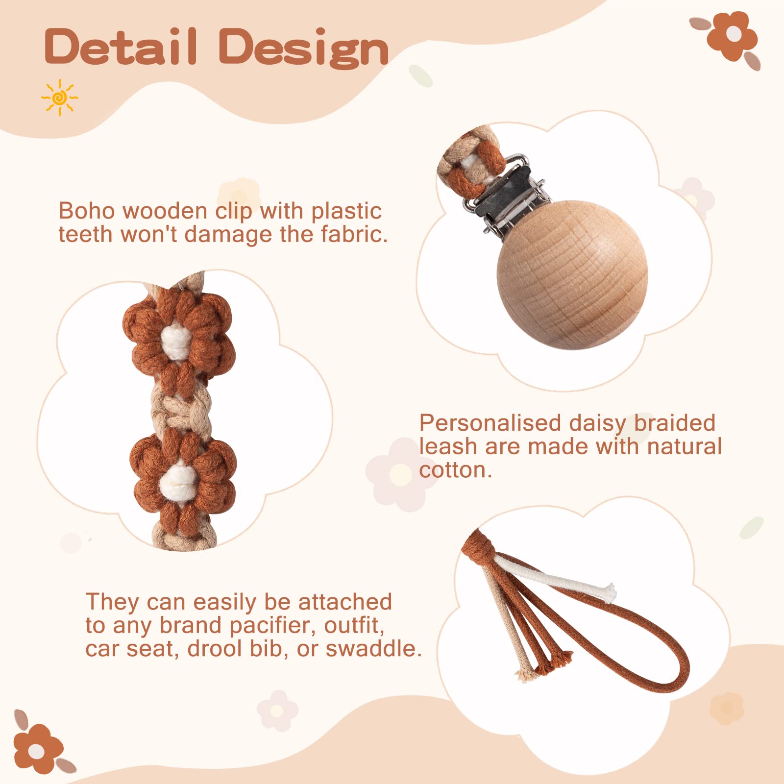 • Q: What is the unique design of the pacifier clip? A: The Symbolife Pacifier Clip features a hand-woven chic daisy pattern and a boho wooden clip, adding a fashionable style that looks great on both baby boys and girls.