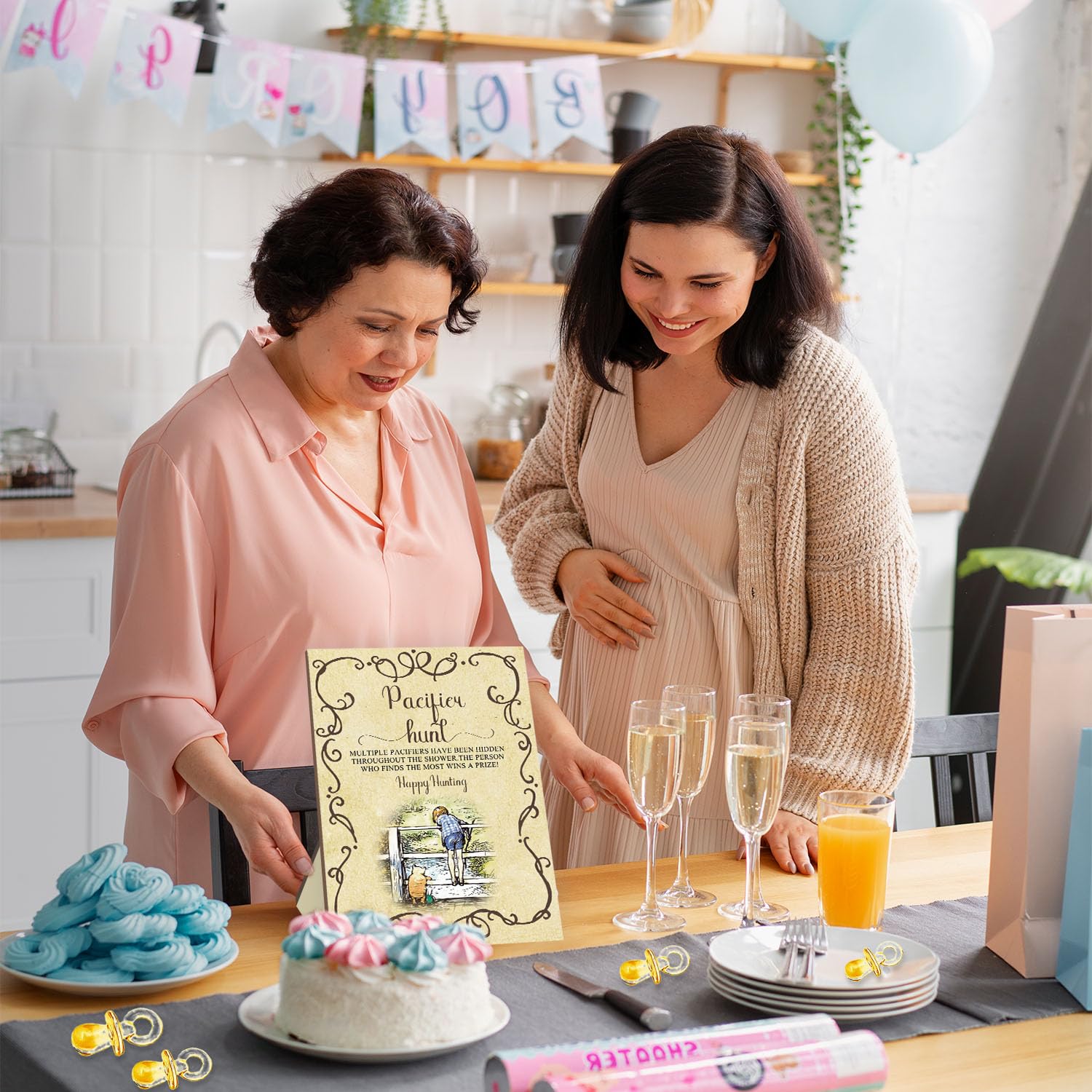 - Q: What is the purpose of the mini pacifiers in the set? A: The mini pacifiers serve both as game pieces for the pacifier hunt and as decorative elements for the baby shower.