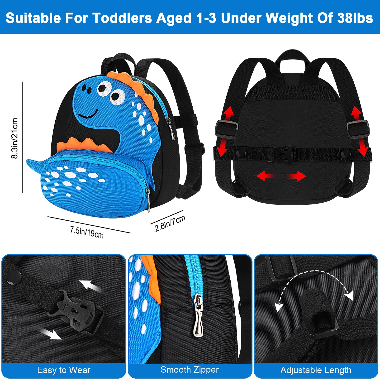 - Q: What features make this backpack ideal for toddlers? A: The backpack features a cute dinosaur pattern, enough capacity for essentials, adjustable straps, and a detachable leash, making it both fun and functional for toddlers.