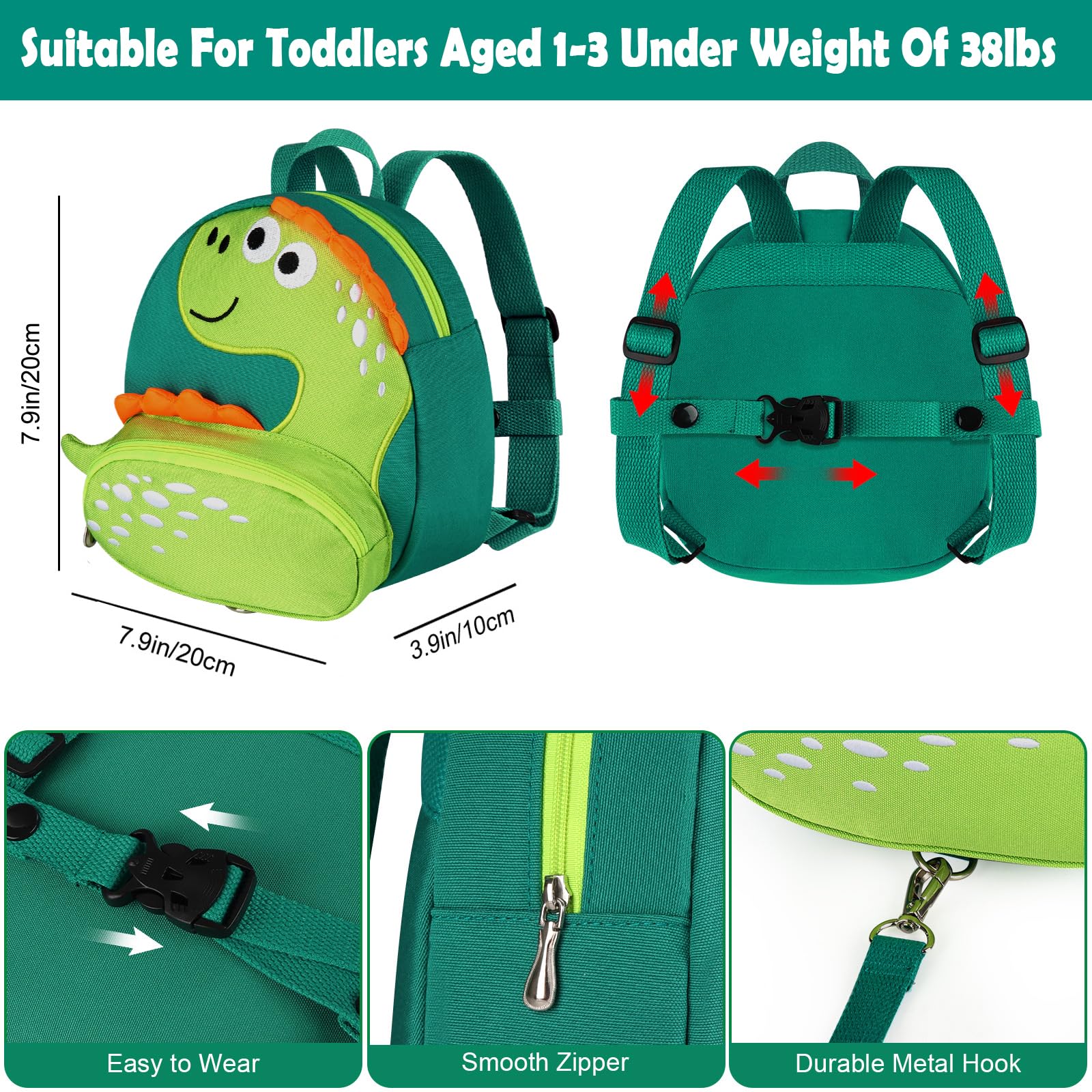 - Q: What features make this backpack unique? A: The backpack features a cute dinosaur pattern, a detachable anti-lost rein, and multiple ways to use it, including as a backpack, with a leash, or with a wrist link.