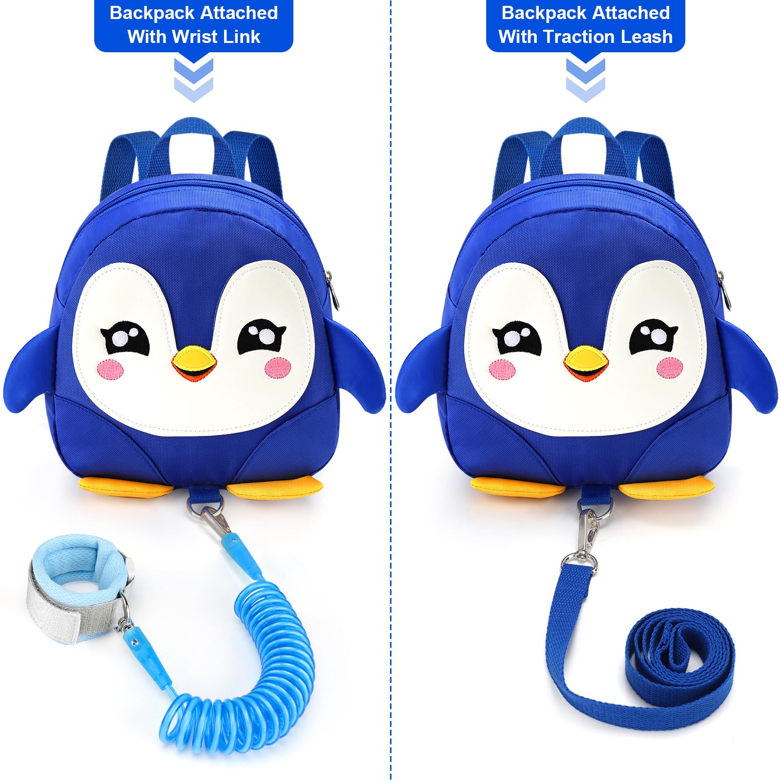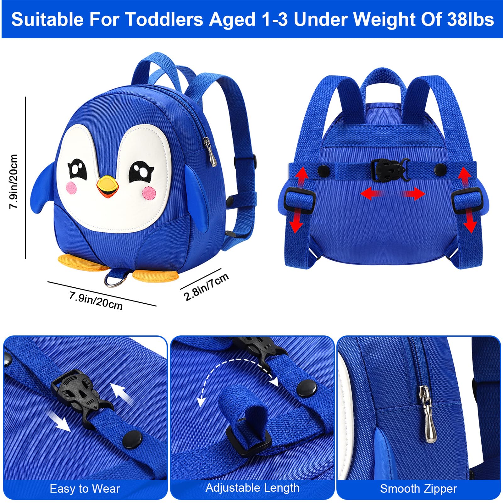 - Q: What are the main features of this harness backpack? A: Key features include a cute Penguin pattern, a detachable anti-lost rein, adjustable shoulder straps, and a mini size that fits toddlers' essentials.
