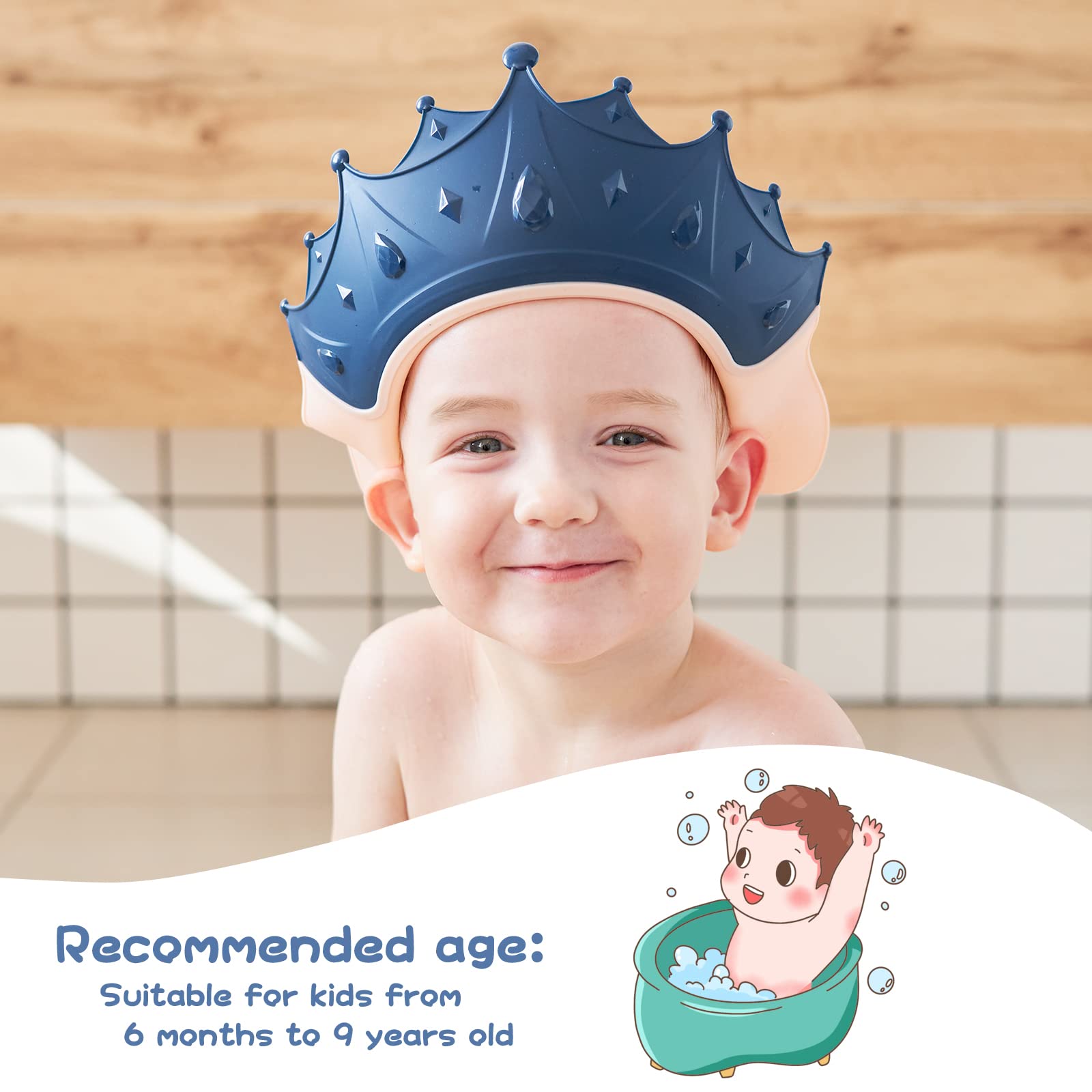 - Q: What age range is this baby shower cap suitable for? A: This baby shower cap is suitable for children aged 0 to 9 years old, accommodating head sizes from 15 to 24 inches.