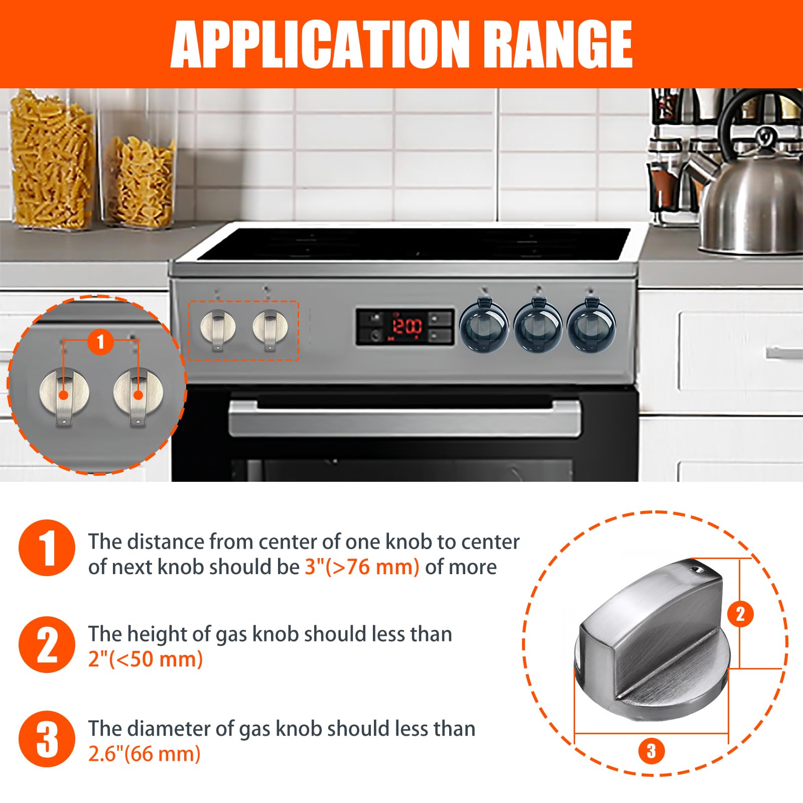 - Q: What sizes do the Stove Knob Safety Covers fit? A: The covers fit knobs with a maximum height of 2 inches, a maximum diameter of 2.6 inches, and require a distance of at least 3 inches between the centers of the knobs.