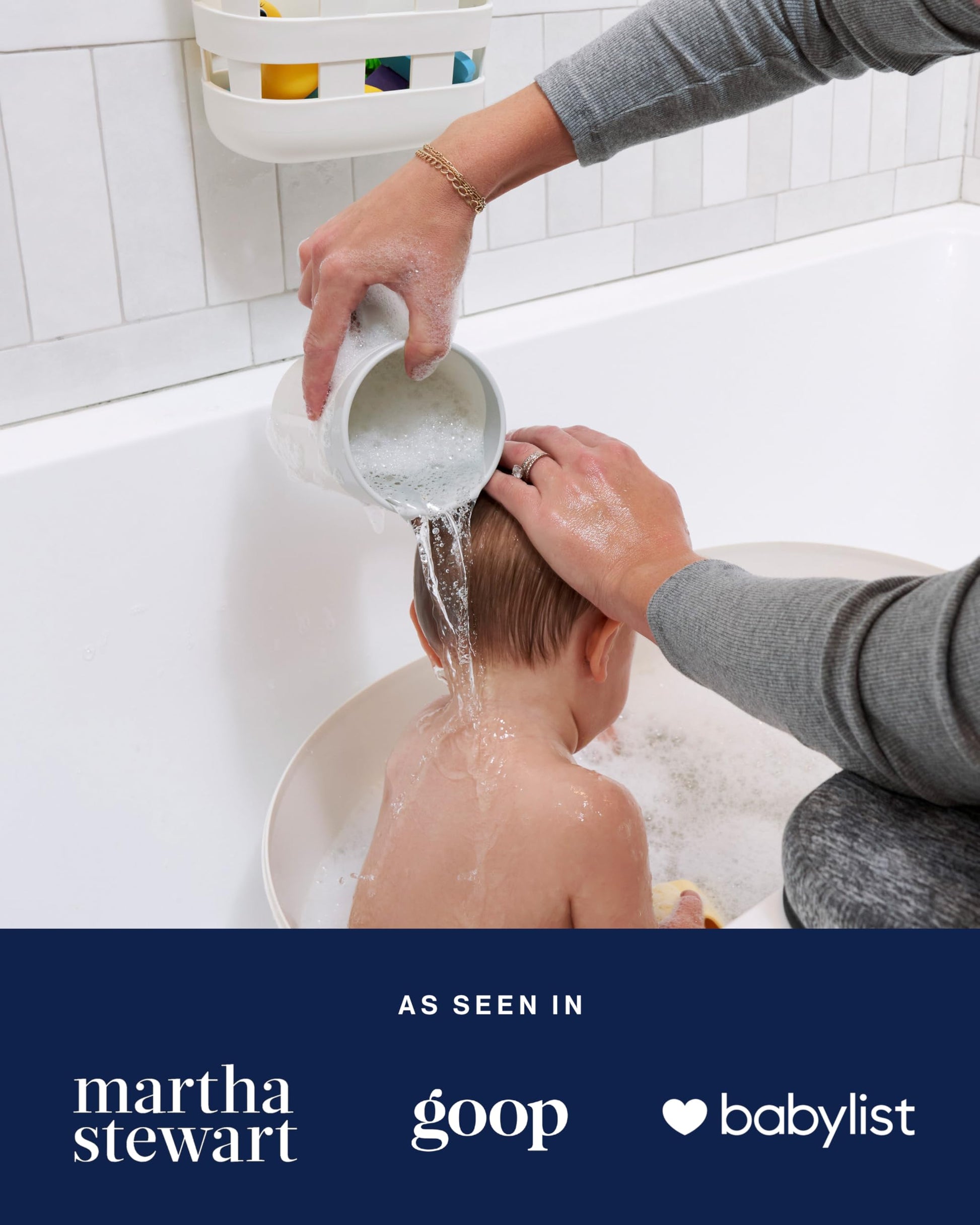 - Q: How does the flexible lip of the rinse cup help during bath time? A: The flexible lip of the rinse cup is designed to gently conform to your baby's head, allowing for a soft flow of water while keeping it away from their face, preventing irritation to their eyes.