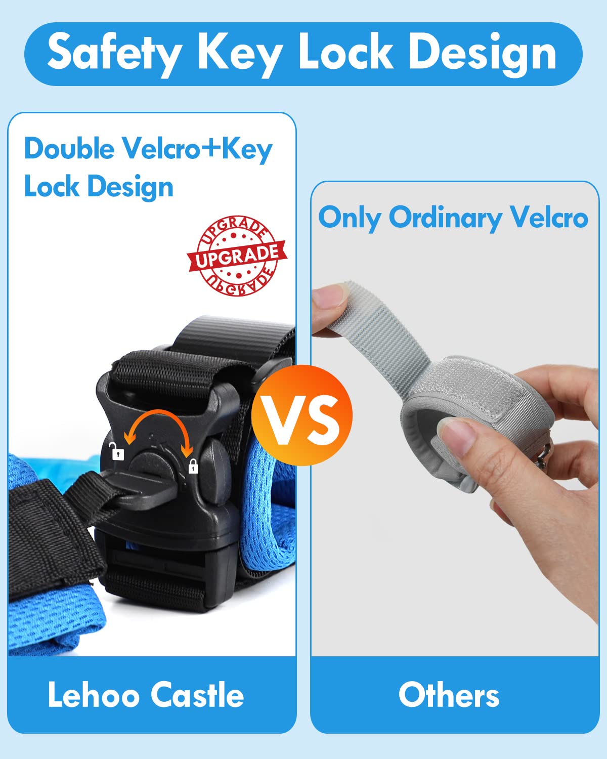- Q: What safety features does this toddler leash include? A: The toddler leash features a safer key lock mechanism that can only be opened with a key at the parent's wrist, and a widened metal head that is difficult to cut off for added security.